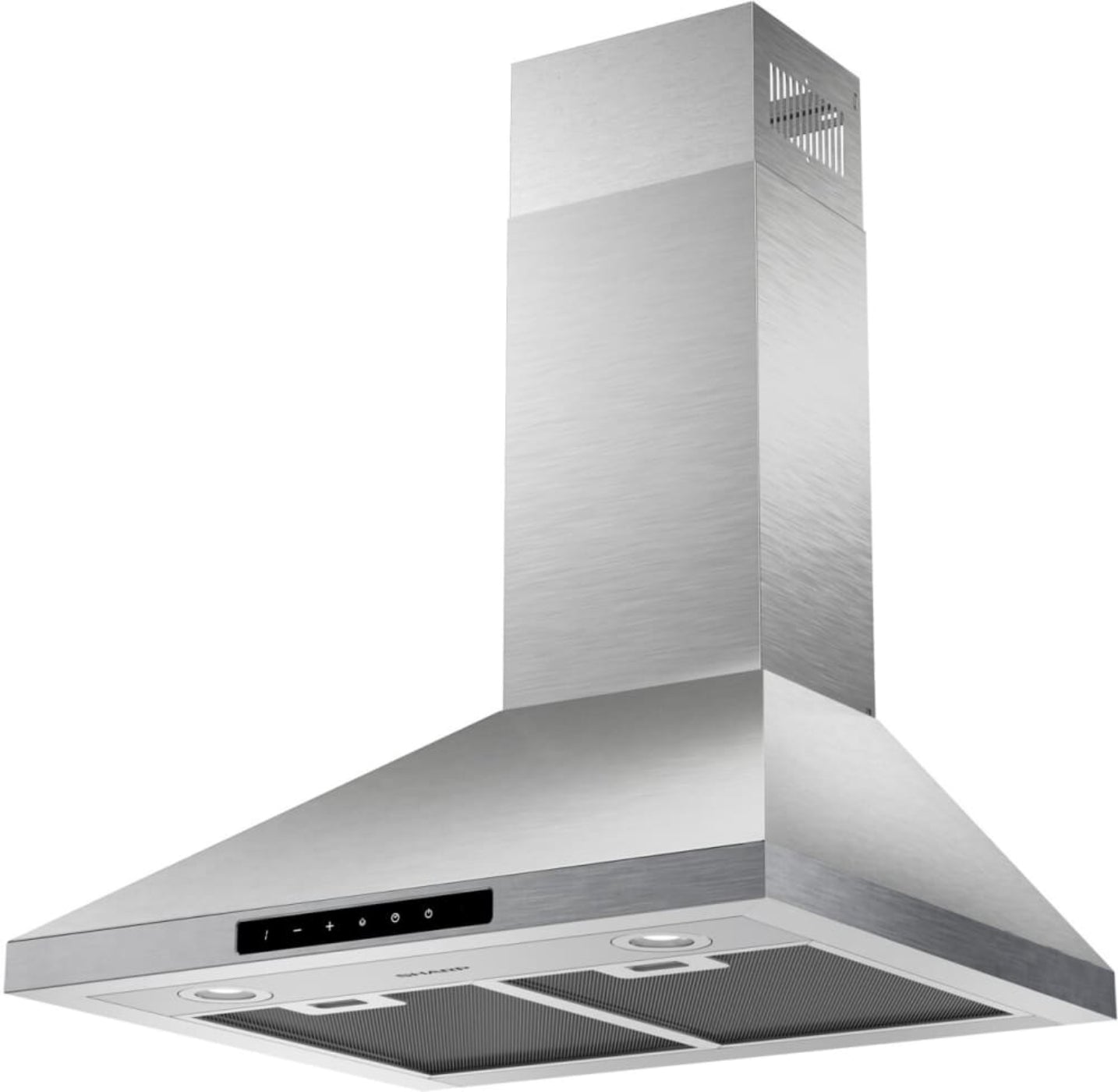The Sharp 24-inch Wall Mount Chimney Range Hood pairs beautifully with other stainless-steel appliances that will complement any kitchen. The bright white LED task lighting adds an elegant finishing touch to your modern kitchen. It comes equipped with everything needed for installation, including a 16-inch chimney and optional extension flue, and will fit most ceilings up to 10 feet. The powerful 3-speed ventilation system features easy-to-reach, easy-to-replace filters and is effective up to 350 cu. ft. per minute. With capacitive touch controls, plus dishwasher-safe mesh grease filters, your 24-inch range hood will become your new favorite kitchen appliance.