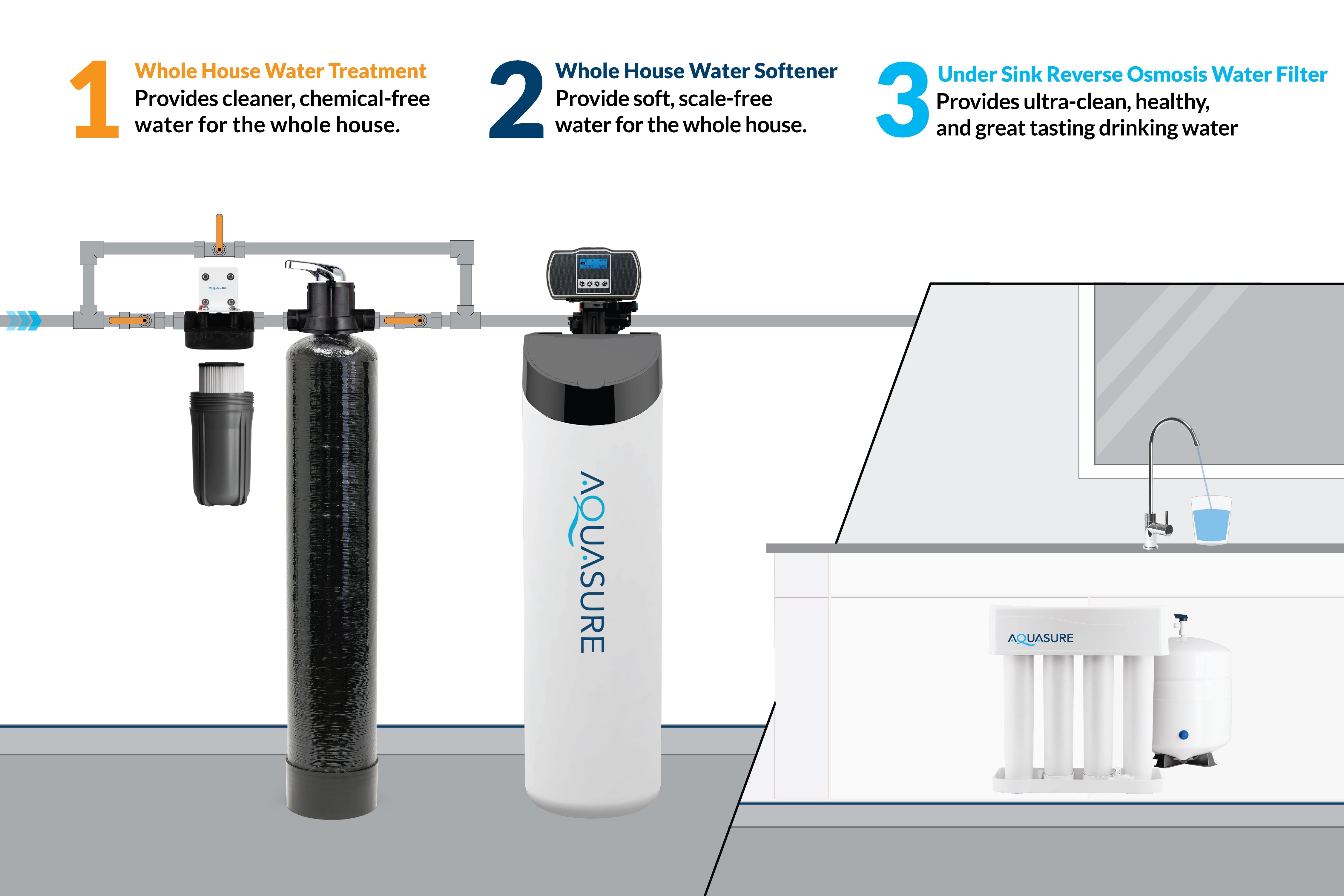 • Bundle includes the Harmony Lite Series 34,000 Grains All-in-One Water Softener (AS-HL34A), Fortitude V2 Pleated Sediment Filter (AS-FS-30PS), Fortitude Pro Water Treatment System (AS-FP600), and Premier Advanced 75 GPD Reverse Osmosis System (AS-PR75A).