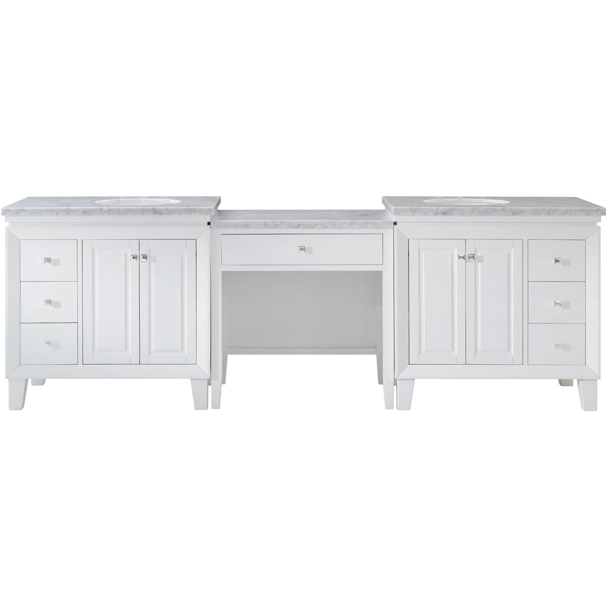A: The vanity has a clean, bright white finish that complements the stunning Carrara marble countertop and the white ceramic undermount sinks.