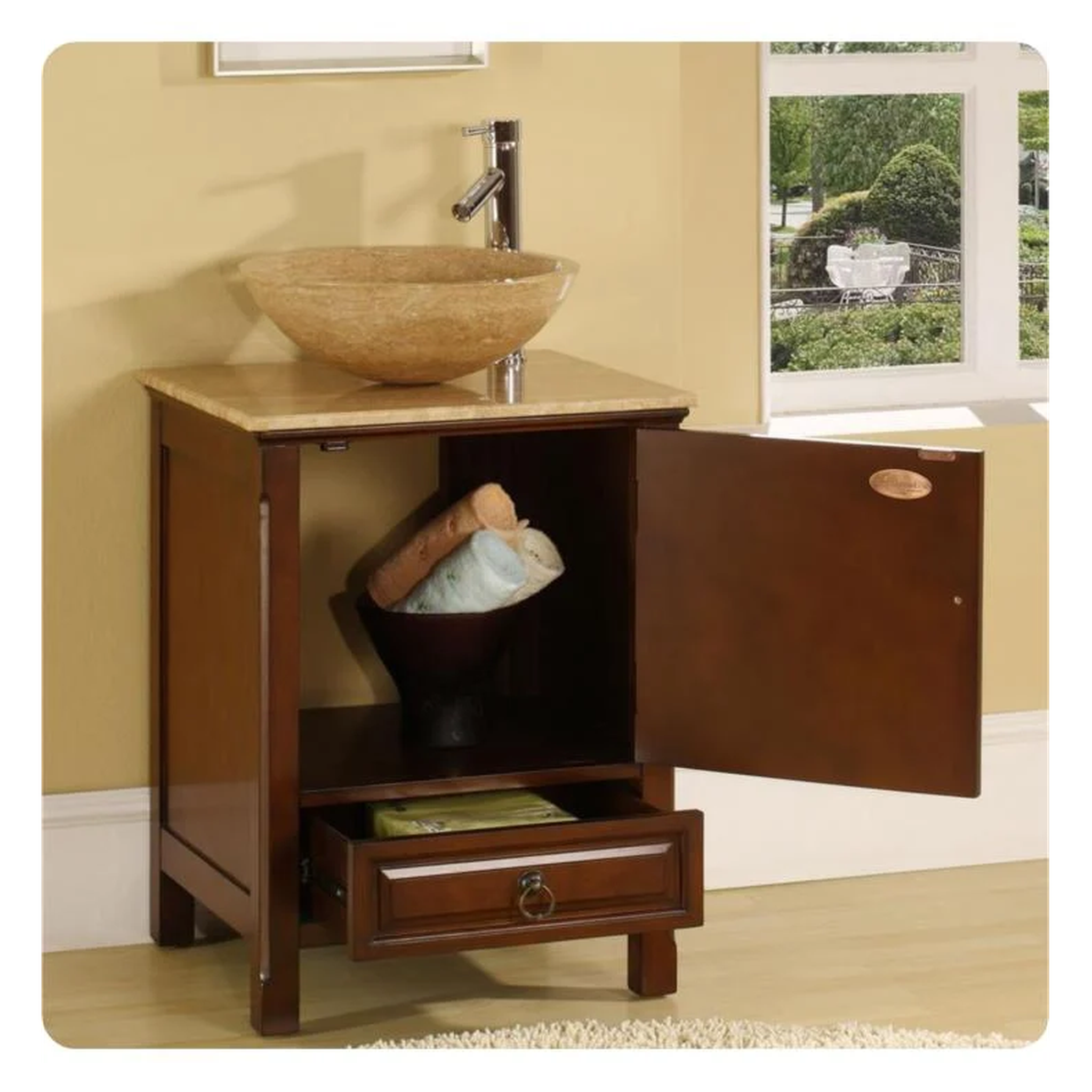 The 22" Single Sink Cabinet makes a bold statement. It features antique cherry finish and travertine countertop. Countertop is pre-drilled to accommodate a vessel bowl sink (sold separately). A single-hole faucet hole is also pre-drilled.