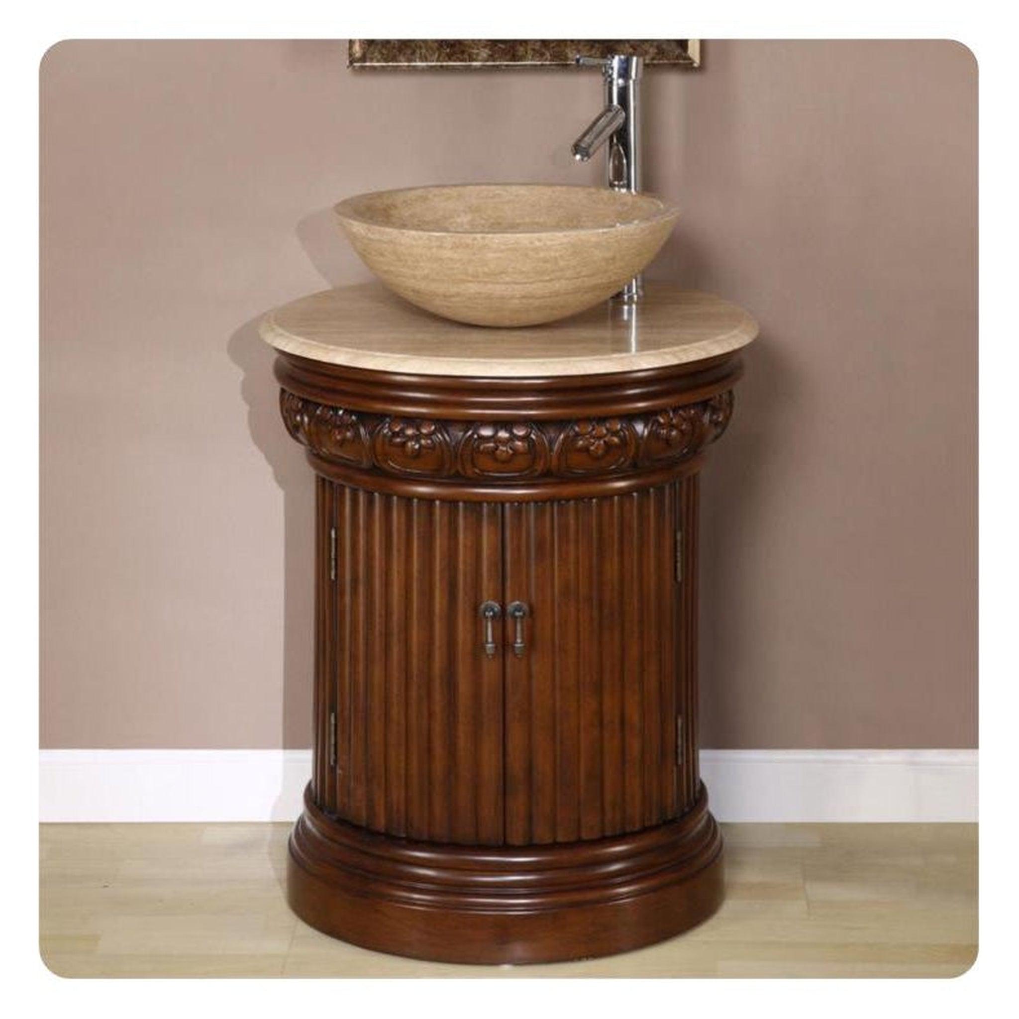 The 22" Single Sink Cabinet makes a bold statement. It features antique cherry finish and travertine countertop. Countertop is pre-drilled to accommodate a vessel bowl sink (sold separately). A single-hole faucet hole is also pre-drilled.