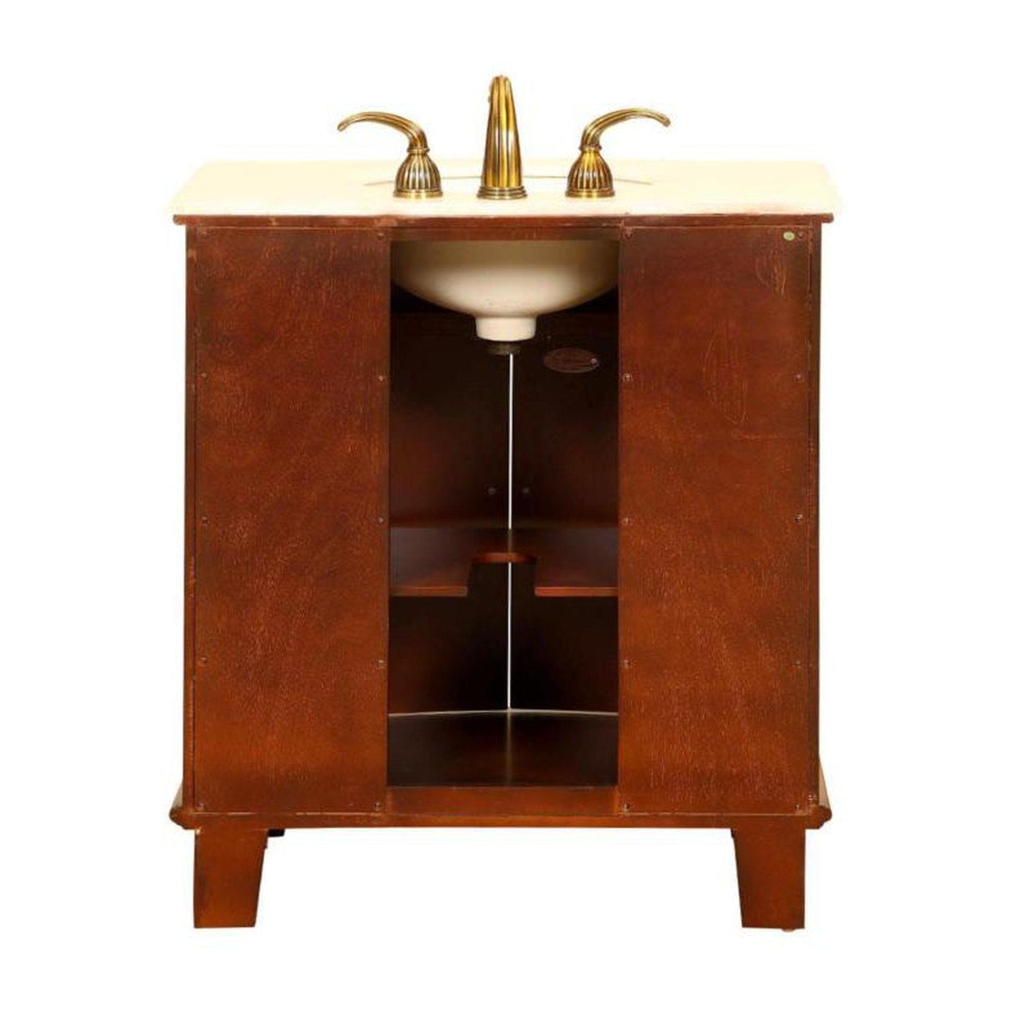 A: This vanity features a rich cherry wood base, a luxurious Crema Marfil marble countertop, and an ivory ceramic undermount sink, offering both durability and elegance.