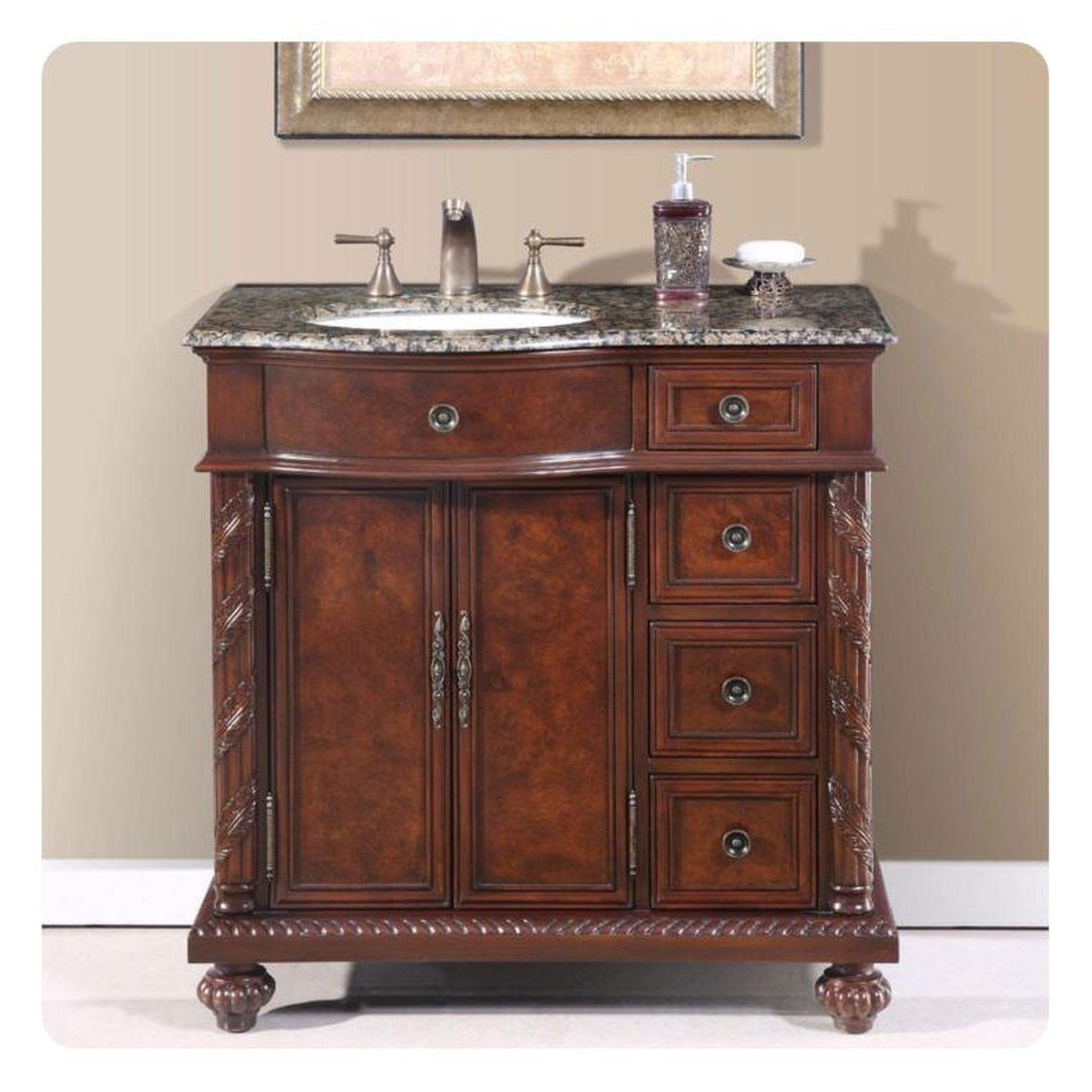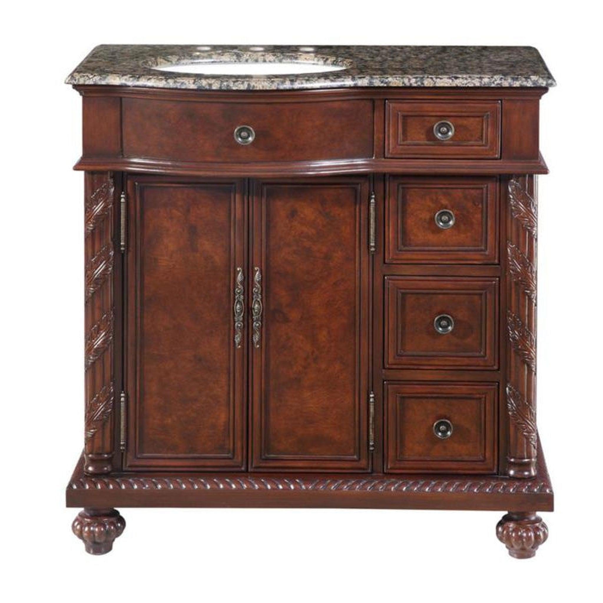 This charming Early American style bathroom sink vanity will add some style and elegance to your bathroom. The contrasting colors give the vanity a knotty wood appearance and features a rounded leading front edge that creates a graceful curve of both the stone and cabinet. Our rich English Chestnut finish, antique brass handles, all natural solid baltic brown granite stone counter top and the detailed decor along the sides and legs thoroughly accentuate the sturdy profile.