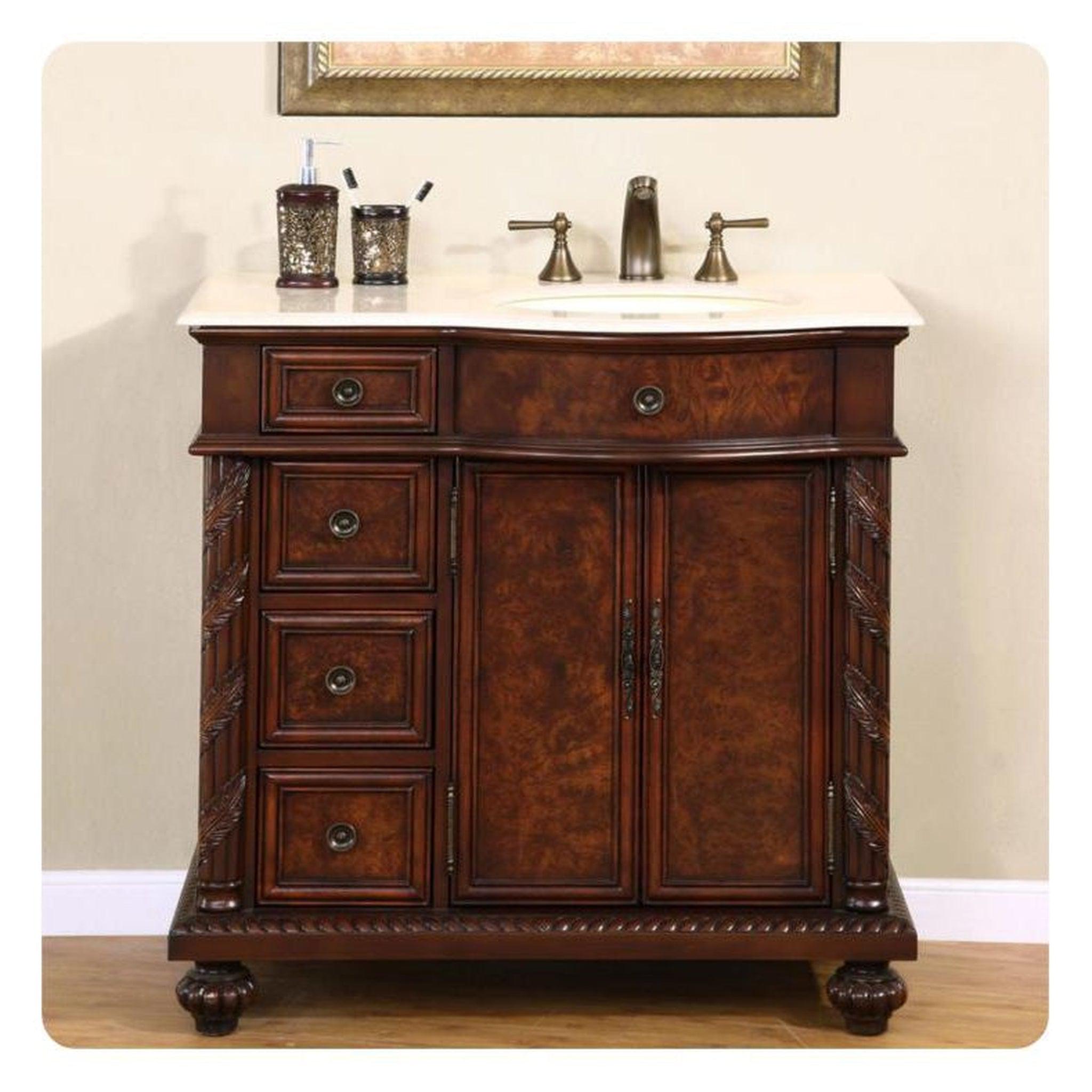This charming Early American style bathroom sink vanity will add some style and elegance to your bathroom. The contrasting colors give the vanity a knotty wood appearance and features a rounded leading front edge that creates a graceful curve of both the stone and cabinet. Our rich English Chestnut finish, antique brass handles, all natural solid crema marfil marble stone counter top and the detailed decor along the sides and legs thoroughly accentuate the sturdy profile.