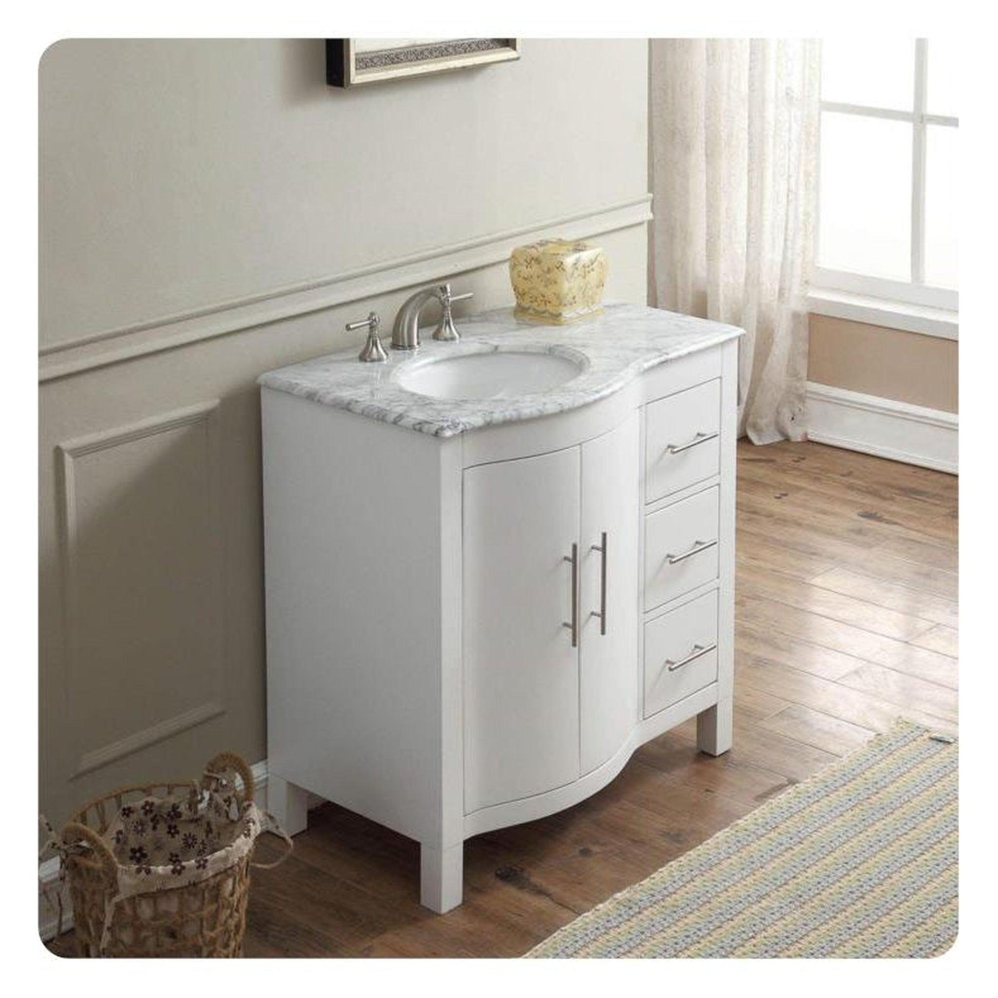 The beauty of this single sink bathroom vanity is the simple yet elegant design coupled with ample storage for you to organize all of your bathroom accessories and necessities. This elegant piece offers a three-drawer storage next to the double doors, all of which are installed with eye-catching designer brushed nickel pull bar handles to highlight the antique white finished cabinet. Our counter top is an all natural solid carrara white marble stone with a pre-installed white ceramic sink bowl on the side. The stone is also finished with a beveled edge around the exterior and bowl opening to add a subtle character while drawing attention to the gorgeous natural stone pattern in the marble.