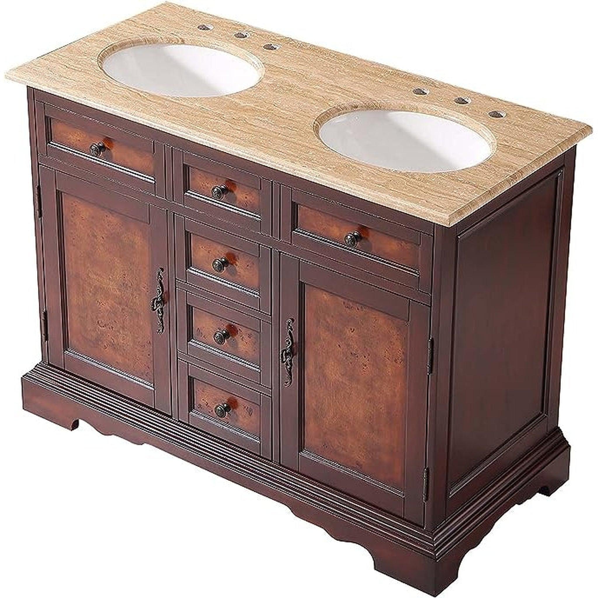 A: The Silkroad Exclusive HYP-0716-T-UWC-48 is a 48-inch double sink bathroom vanity featuring a rich Red Chestnut finish, a natural travertine countertop, and two white ceramic undermount sinks.