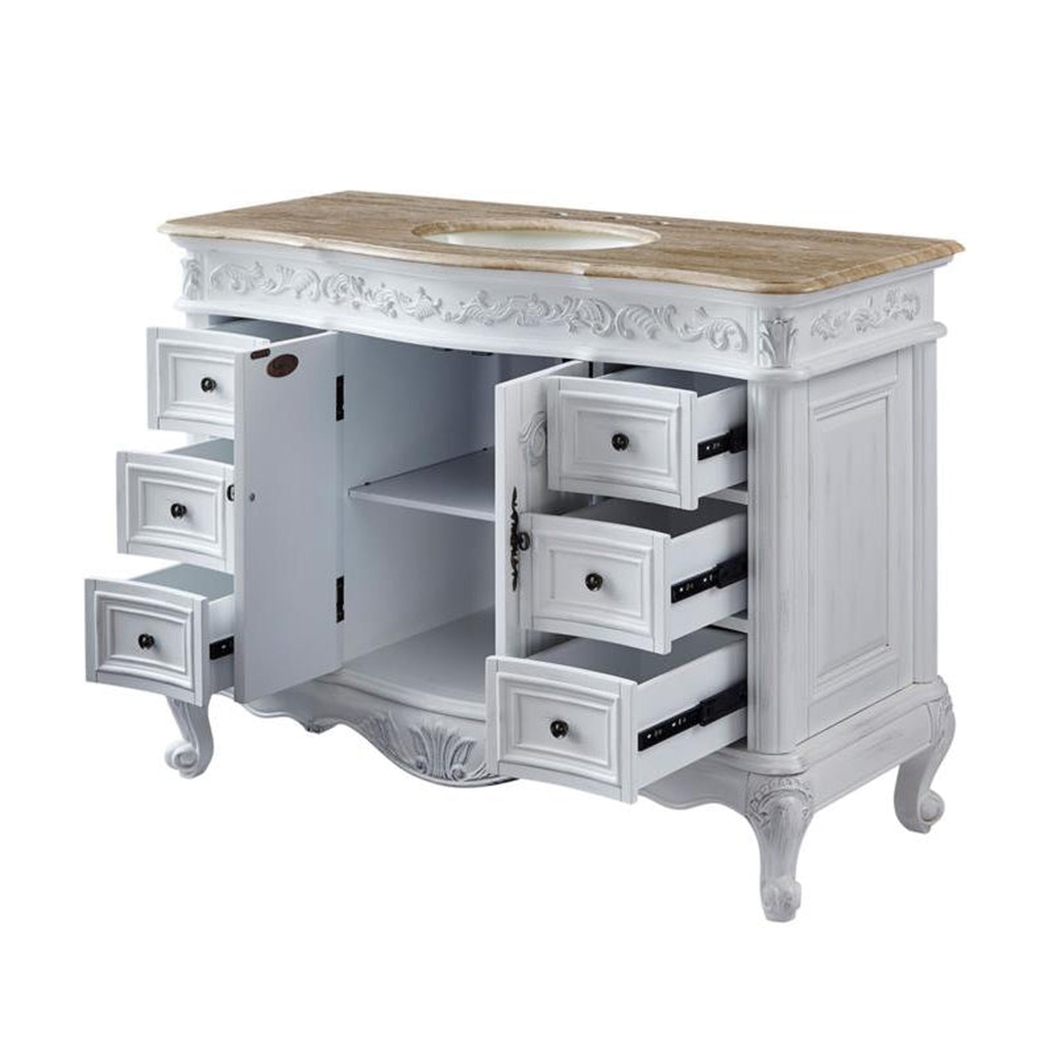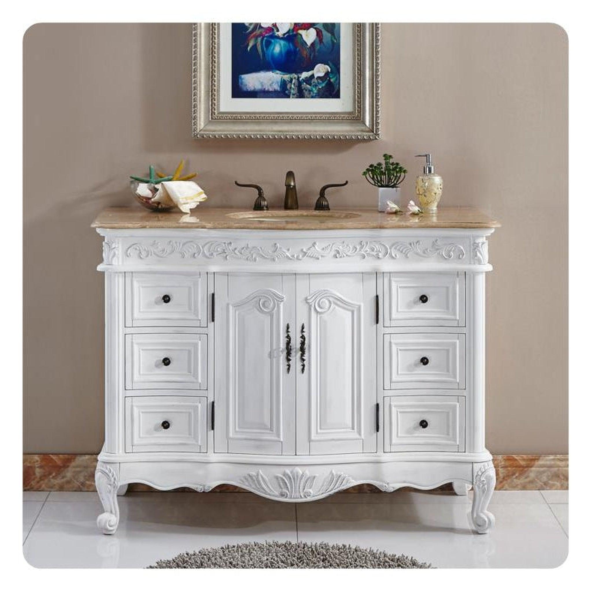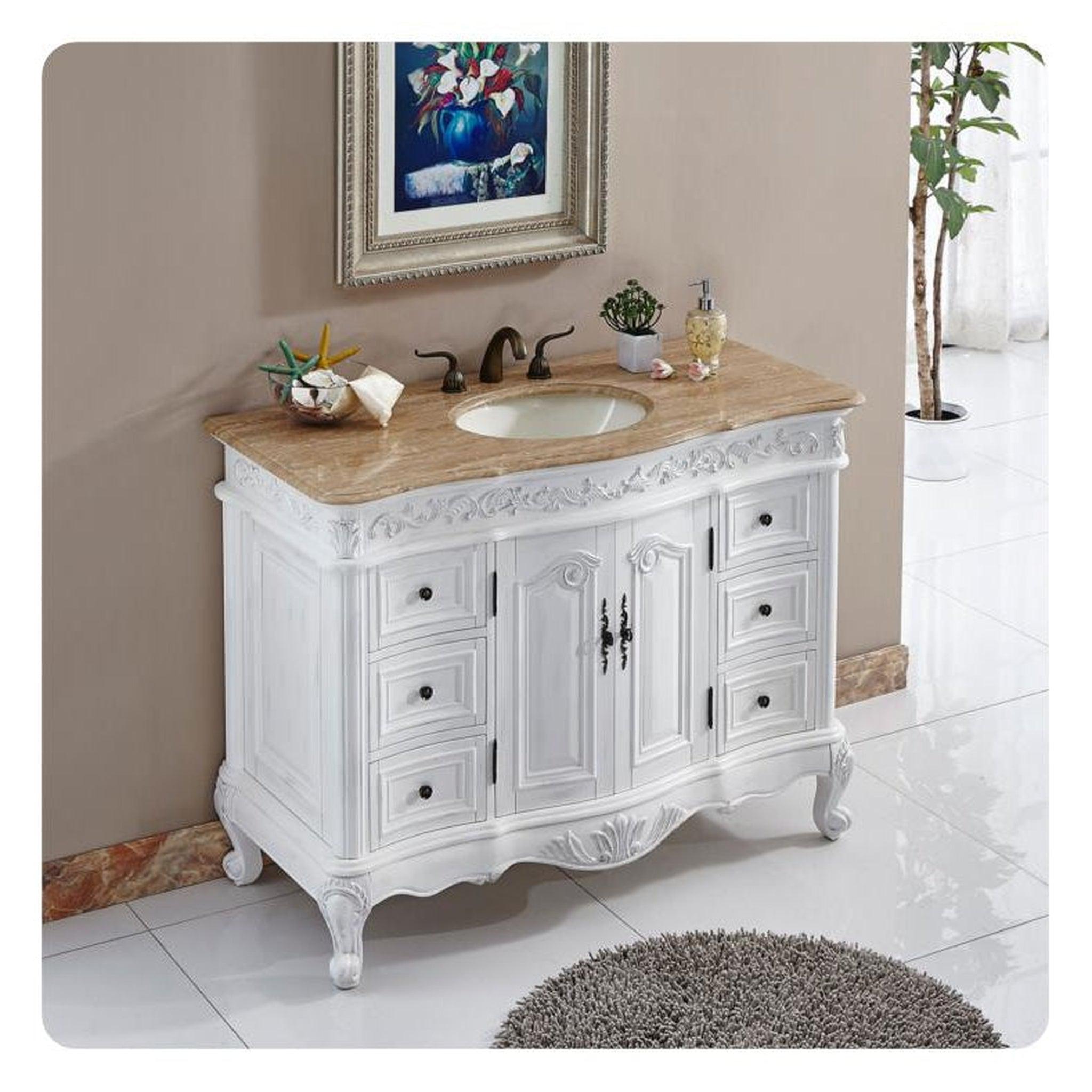 A: The antique white finish and travertine countertop give this vanity a timeless, classic look that suits traditional, transitional, and even some modern bathroom styles.