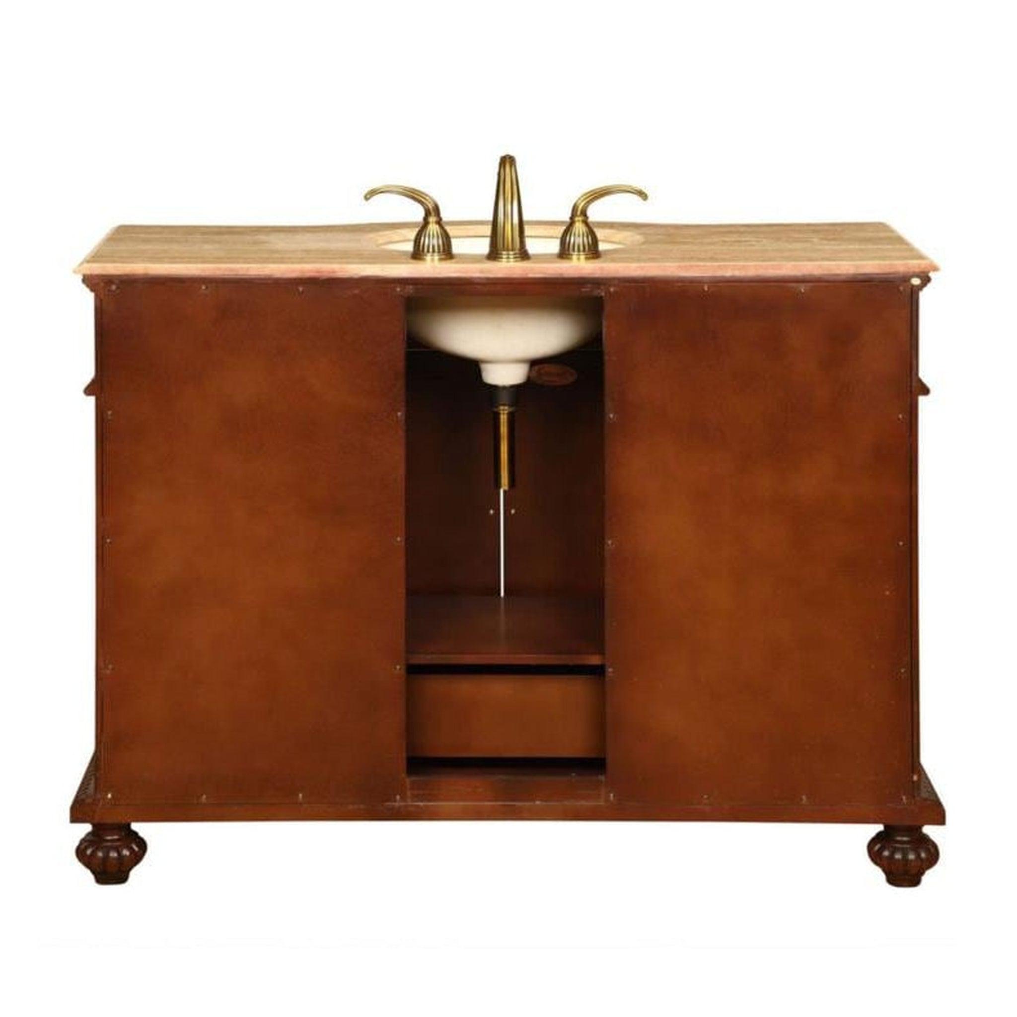 This is a charming Early American style single sink with contrasting colors that give this vanity a knotty cherry wood appearance. Elegant and traditional, this beautiful piece features our rich Red Mahogany cabinet finish, complementary antique brass handles, classical carvings throughout the cabinet that accentuate the sturdy profile and steadfast craftsmanship, a hidden drawer that provides you discreet extra storage, ivory ceramic under mount sink and our all natural solid travertine stone counter top. The stone is finished with a beveled edge around the exterior and bowl opening to add a subtle character while drawing attention to the gorgeous natural veining in the travertine, which was formed by tidal forces and extreme pressures deep within the Earth.