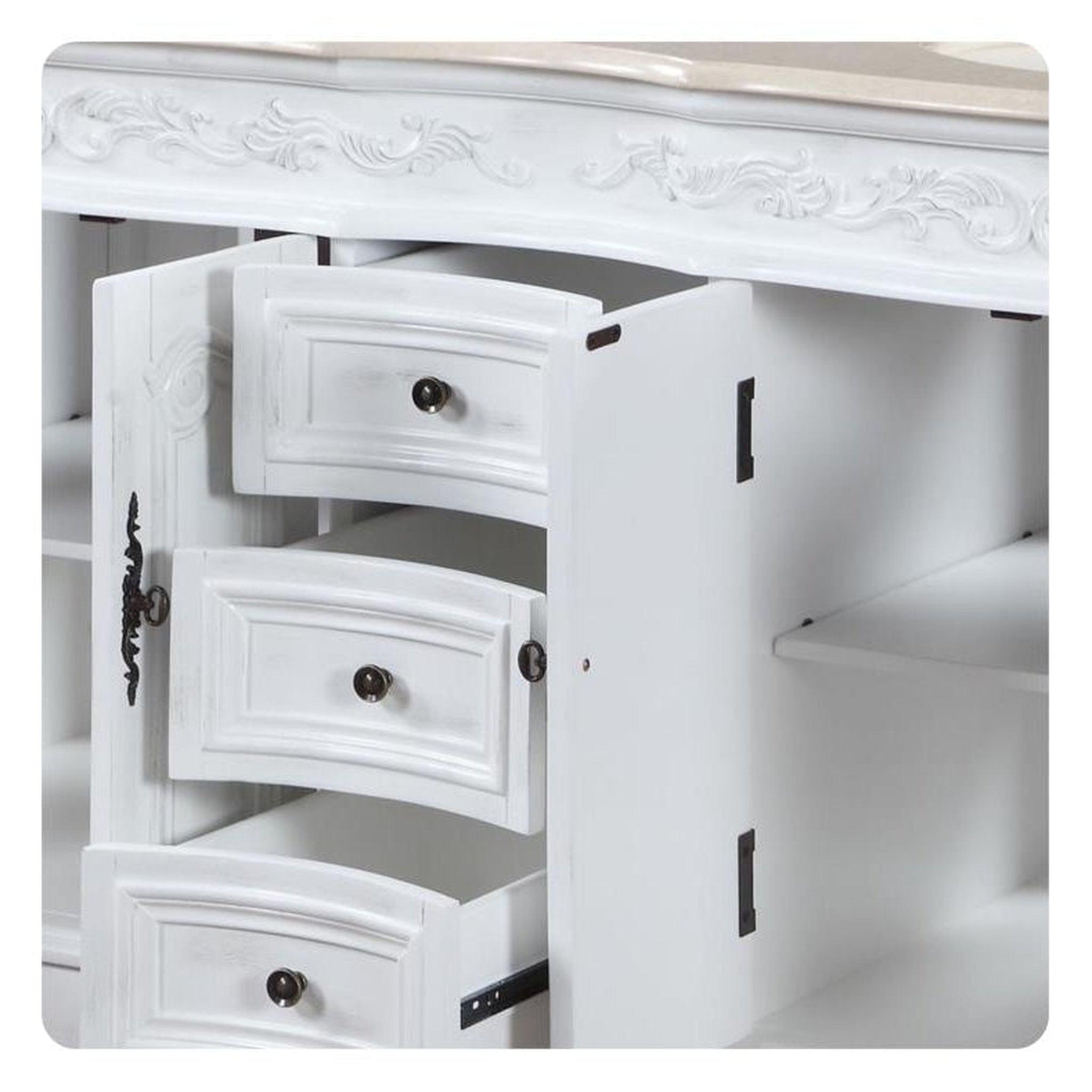A: The Silkroad Exclusive HYP-0145-CM-UIC-58 is a 58-inch double sink bathroom vanity featuring an elegant Antique White finish, a luxurious Crema Marfil marble countertop, and two ivory ceramic undermount sinks.