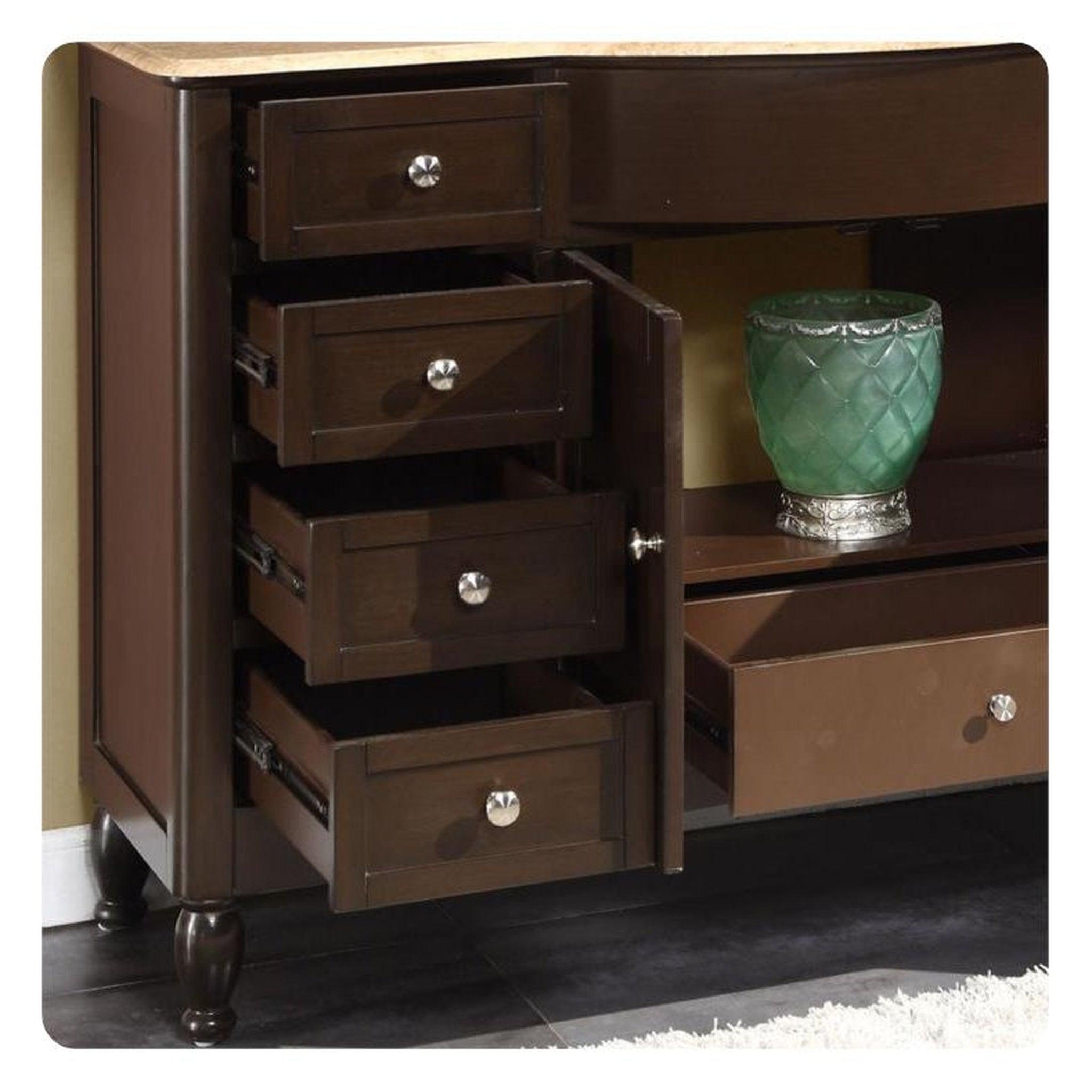 A: The Silkroad Exclusive HYP-0717-T-UWC-58 is a 58-inch single sink bathroom vanity featuring a rich Dark Walnut finish, a natural travertine countertop, and a white ceramic undermount sink.