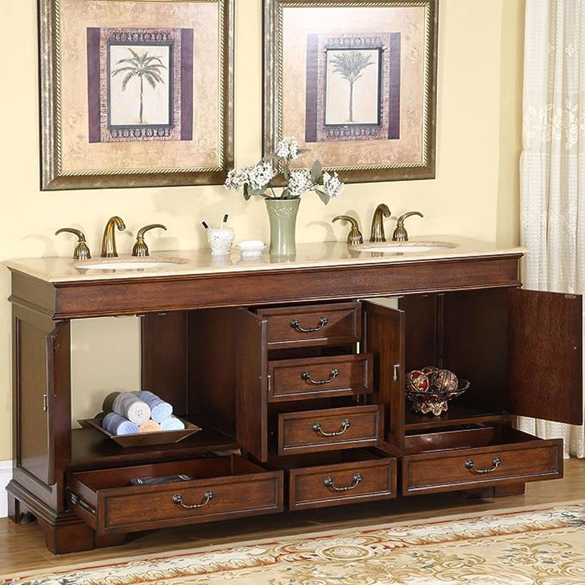 A: The Silkroad Exclusive HYP-0715-T-UIC-72 is a 72-inch double sink bathroom vanity featuring a warm Red Chestnut finish, a durable Travertine countertop, and two ivory ceramic undermount sinks.