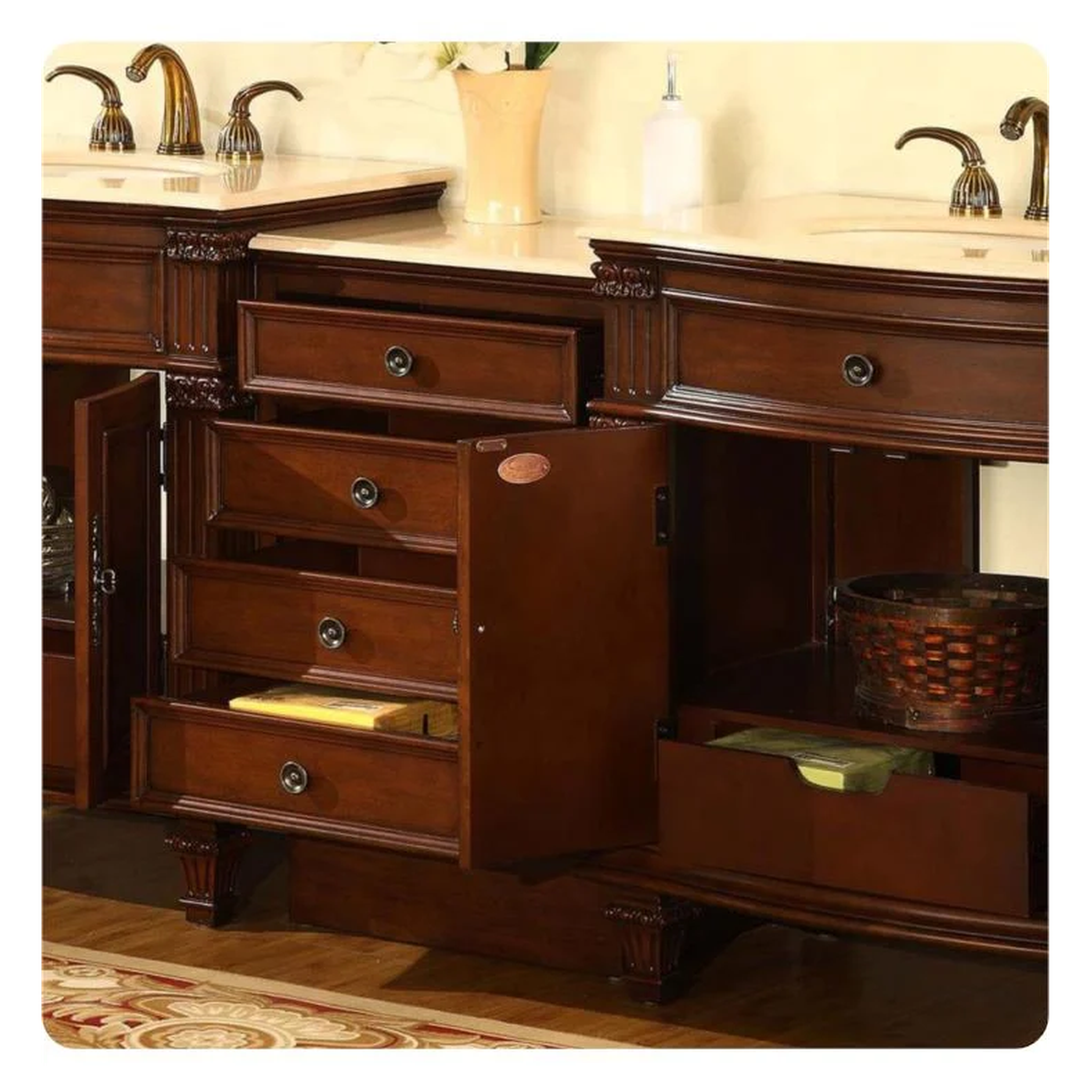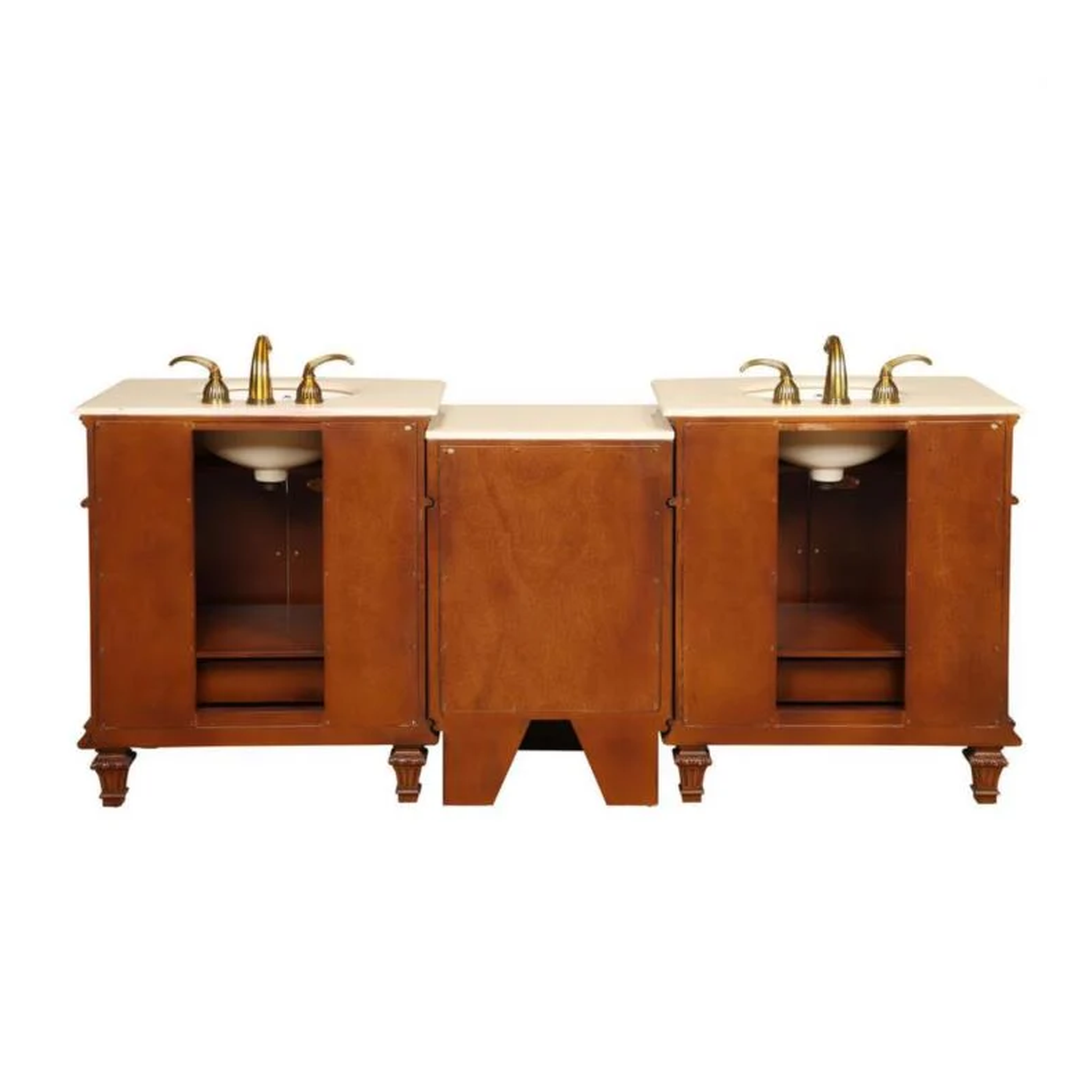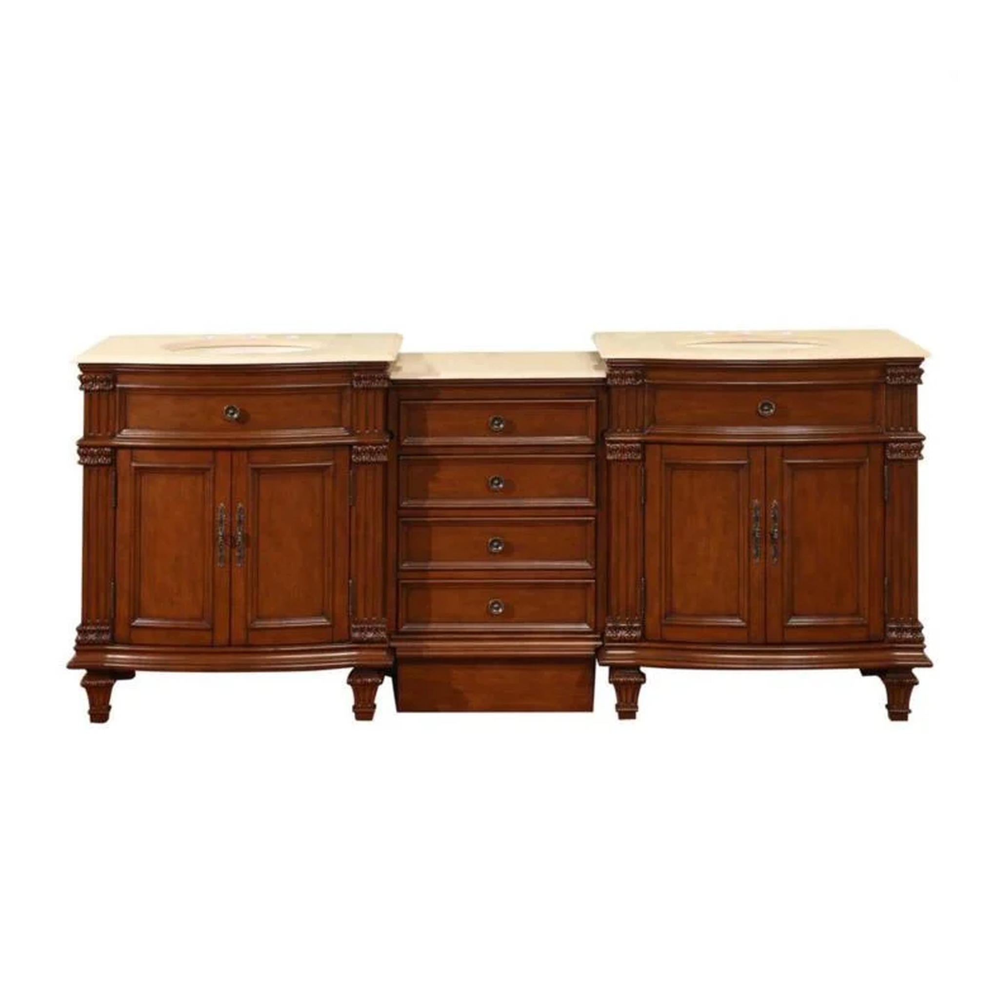 This charming colonial style double sink vanity will create a peaceful and relaxing atmosphere in any style washroom. With detailed decor throughout the cabinet to accentuate the sturdy profile, a rounded leading front edge creates a graceful curve of both the stone and wood cabinet. The transitional style of this bathroom vanity will incorporate smoothly into your bathroom remodel. This modular vanity set comes with three independent units, including two single sink vanities and a drawer bank. The units can be placed in any arrangement, giving you the flexibility to work with any design. A large cutout in the back will make plumbing installation an easier job as well.