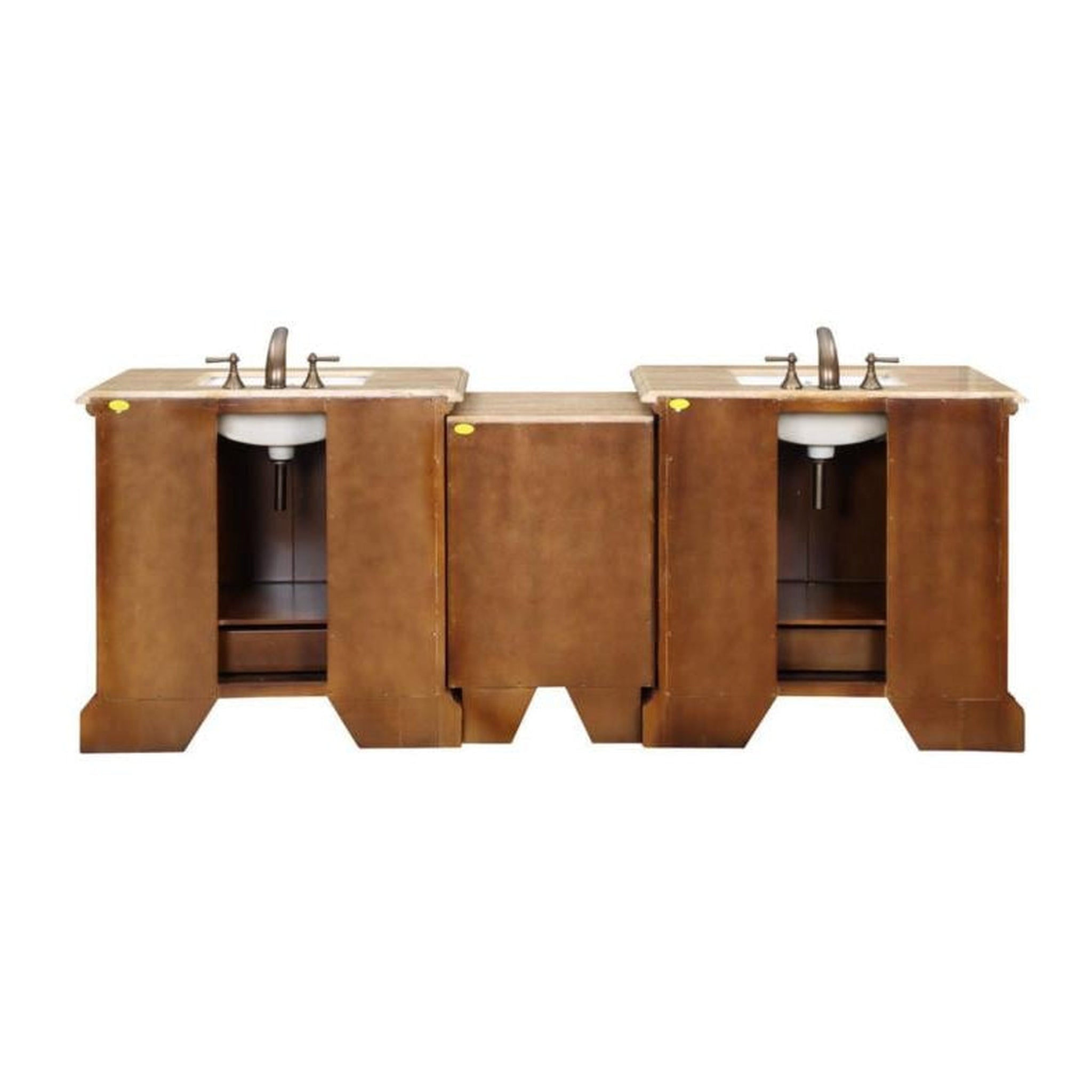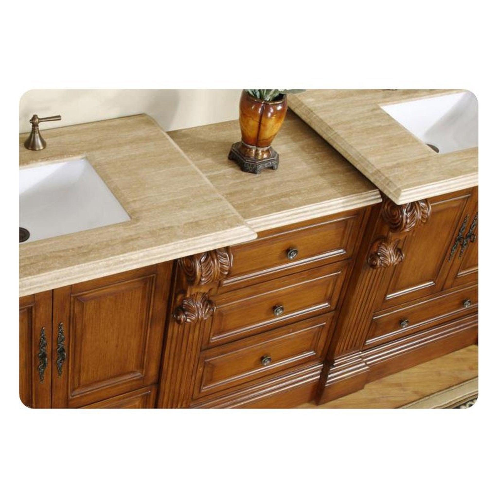 A: This elegant vanity is crafted from high-quality cherry wood, featuring a luxurious travertine stone countertop. It includes two white ceramic undermount sinks, offering a classic, refined look.
