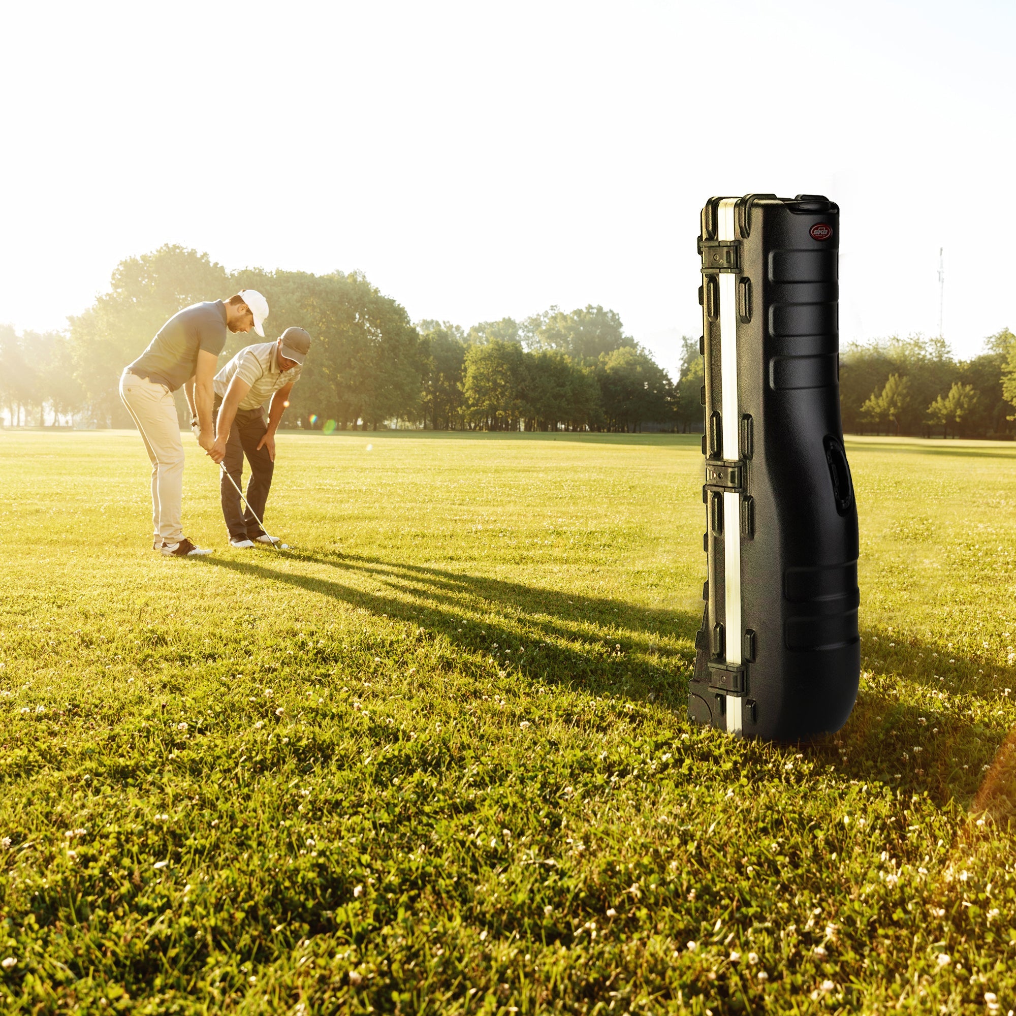 Dreaming of that next extravagant golf outing? Planning a flight across the country, or maybe the world, for that once-in-a-lifetime playing experience? If so, you're going to need to travel with your clubs. Keep your clubs safe and secure during travel with the SKB Cases ATA Deluxe Standard Golf Bag Travel Case.Constructed with ultra-high, molecular-weight polyethylene hard plastic, this case is built to keep your bags and clubs safe and secure. Contoured to hold cart bags, carry bags, and drivers up to 48 inches long, this case is versatile enough to meet your golf bag needs. The patented industrial-strength laches ensure the overall latched security of your golf clubs when flying through the air. Thanks to the Perfect Match valence bending system and TSA Locking System, this case makes traveling through TSA checkpoints easier than ever. The interior dimensions are (L x W x D): 48.75 x 11.13 x 14.25 inches or (L x W x D): 123.83 x 27.94 x 36.20 centimeters. Measure your clubs to ensure a suitable fit inside this travel case.Leave your worries at home and keep your clubs safe and secure on the road with this durable travel case. The SKB Cases ATA Deluxe Standard Golf Bag Travel Case gives you peace of mind on your travels. Once you arrive at the course you and your clubs will be ready to play.
