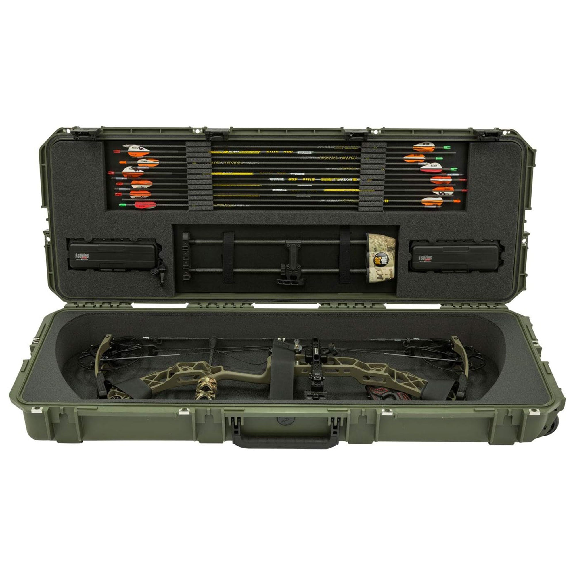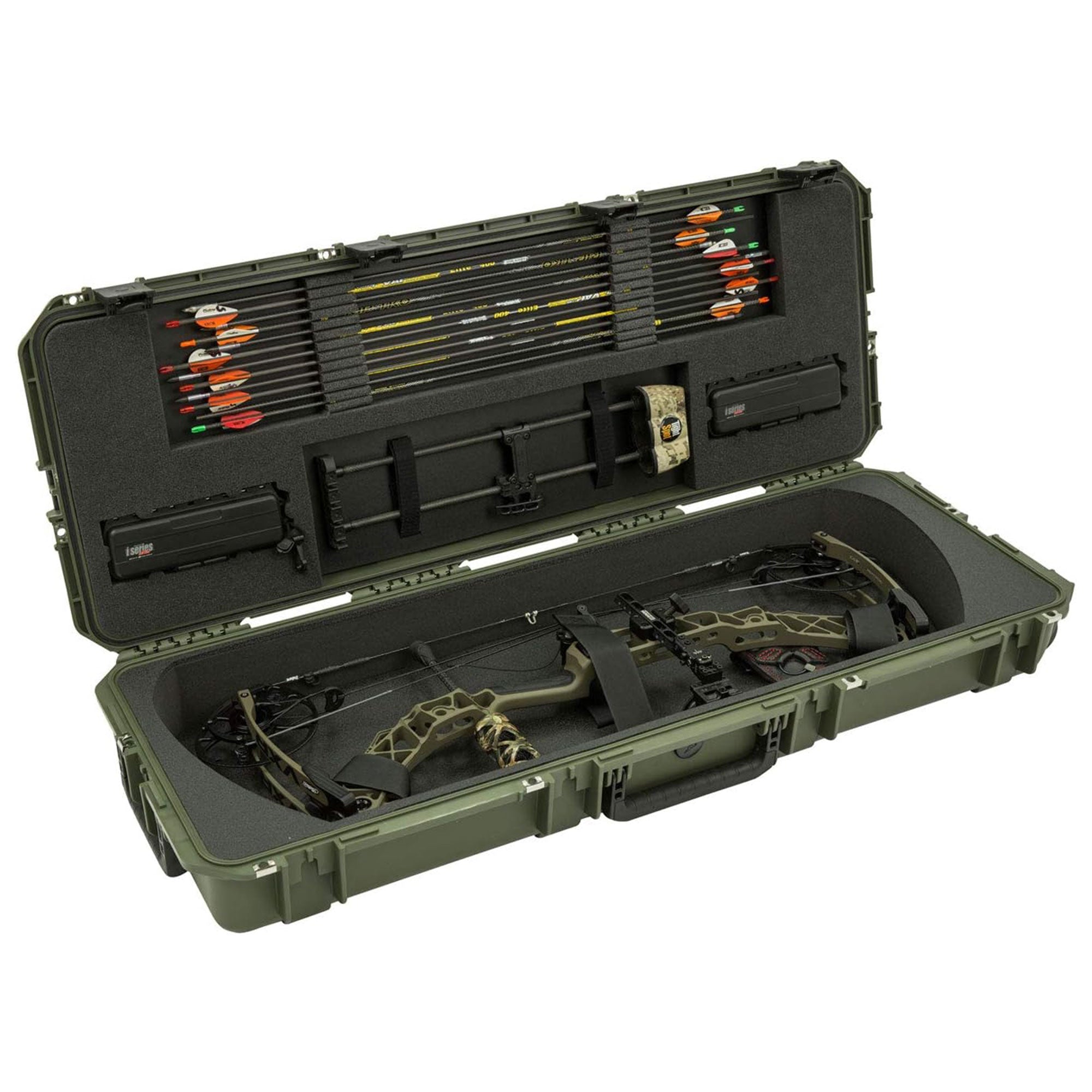 Safety is a priority when transporting hunting equipment. Ensure your bow remains safe with the SKB Cases iSeries 4214 Bow Case.This hard case has 4 patented trigger latches, 4 reinforced padlock locations, cushioned snap-down handles on 3 sides, and in-line skate-style wheels for transporting your gear worry-free. The interior of the bow case features a custom foam insert for secure positioning and cushioning of your gear with a water-jet cut foam arrow system that holds up to 12 arrows.The uni-body, military-grade design eliminates the need for excessive metal reinforcing hardware found on traditional flight cases, allowing for a lighter-weight case, less than 20 pounds when empty. This bow and arrow case protects from impact damage, giving you peace of mind in any environment.Don't take a shot in the dark when you're buying your bow case. Get the best of the best with the iSeries 4214 Hard Exterior Single Parallel Limb Bow Case from SKB.