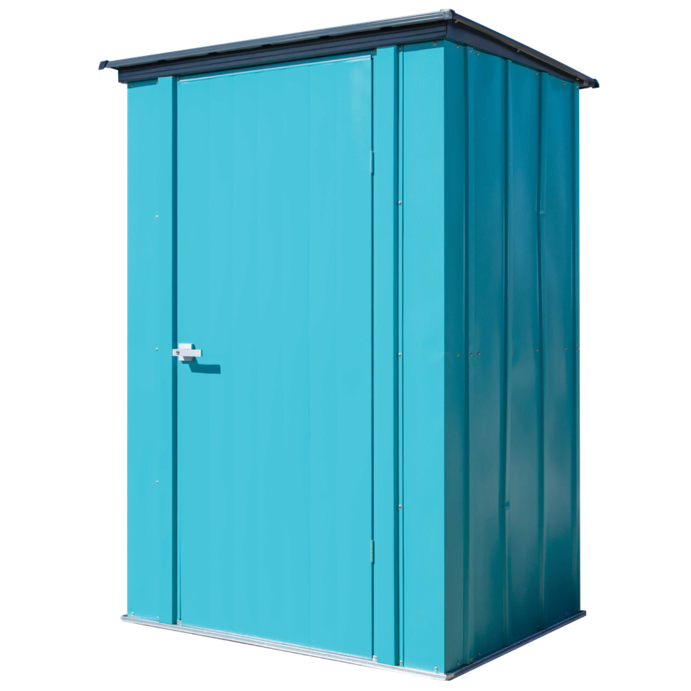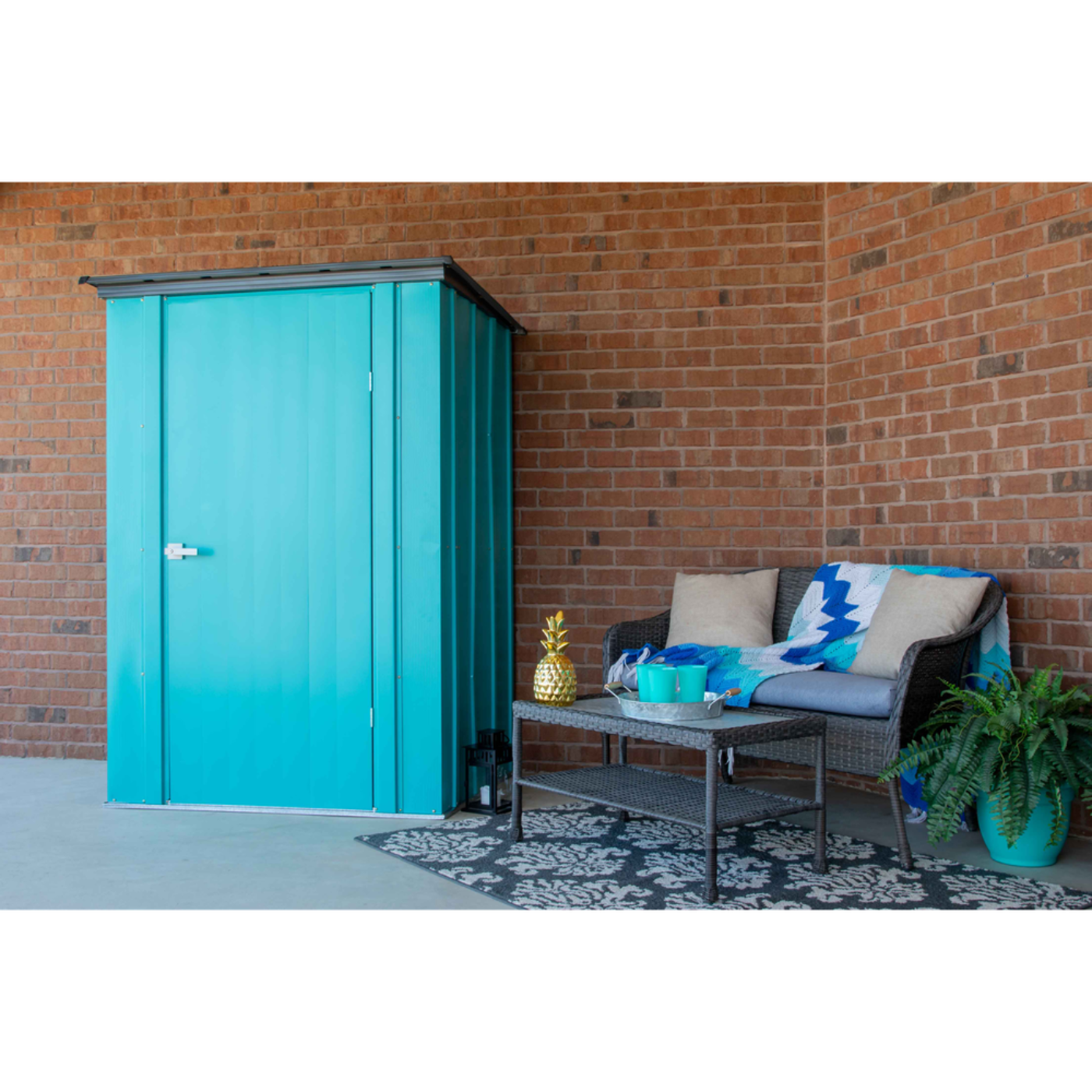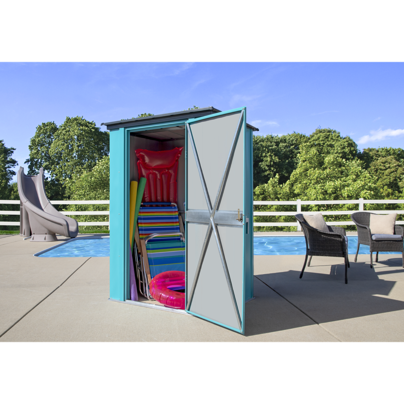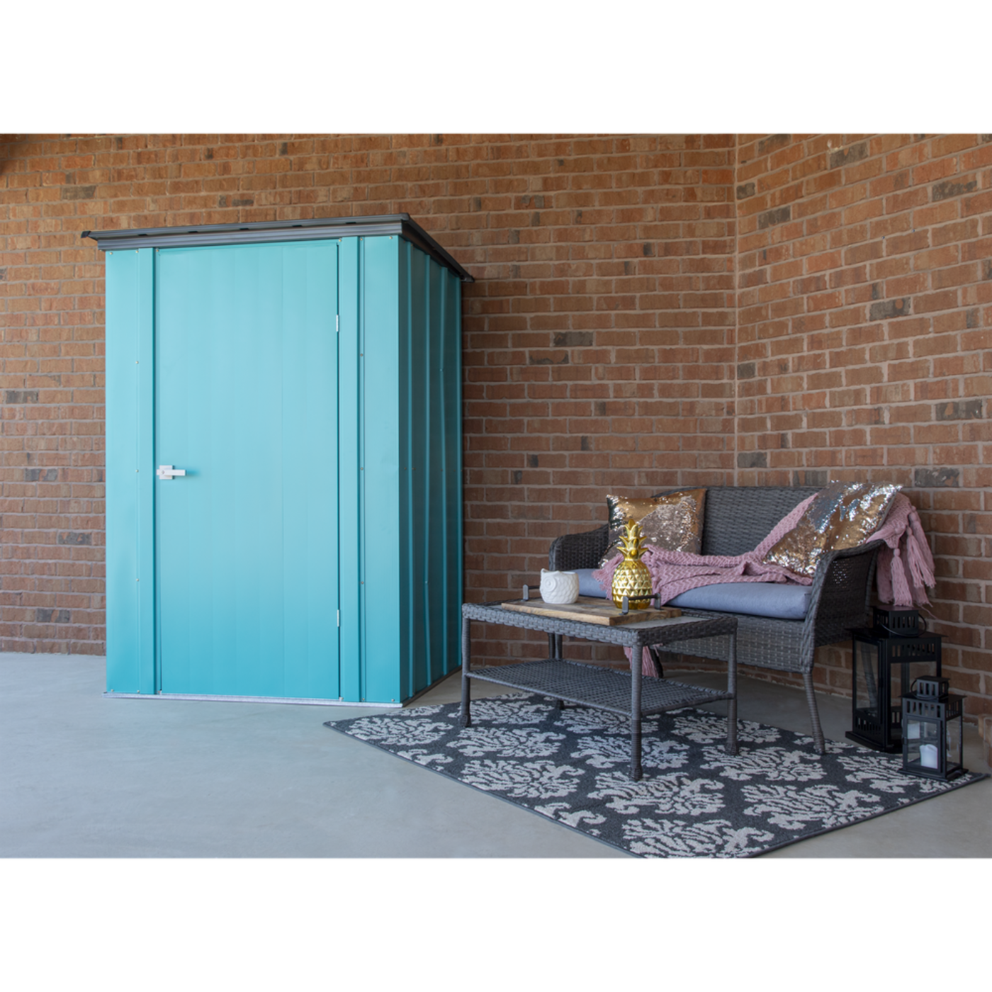 The Spacemaker Patio Shed 4 x 3 Ft. in Teal and Anthracite - CY43T21 is a stylish and compact storage solution designed for small outdoor spaces.