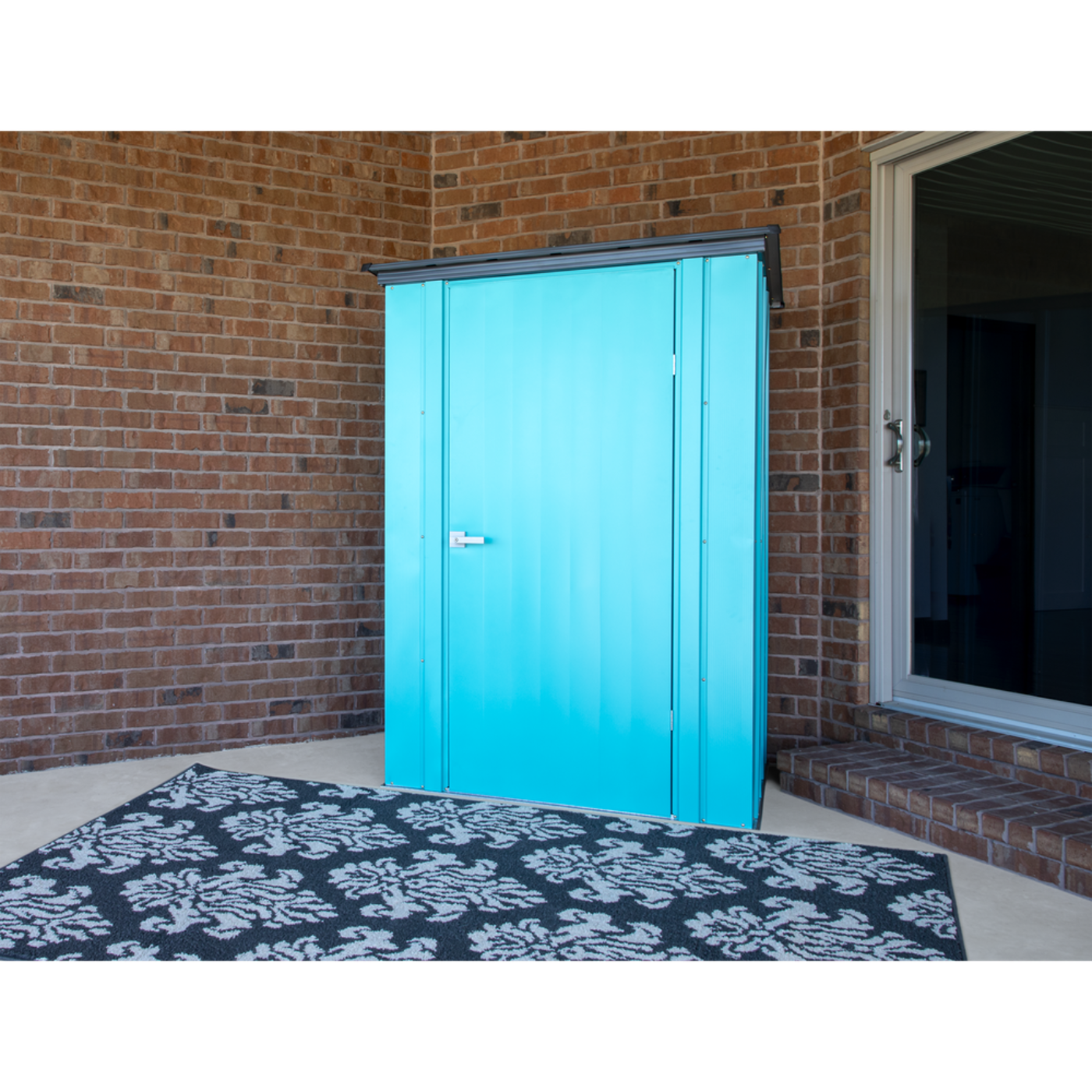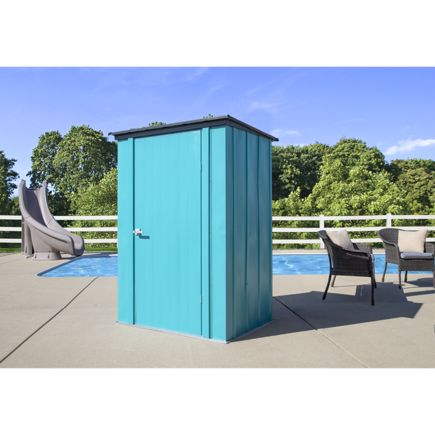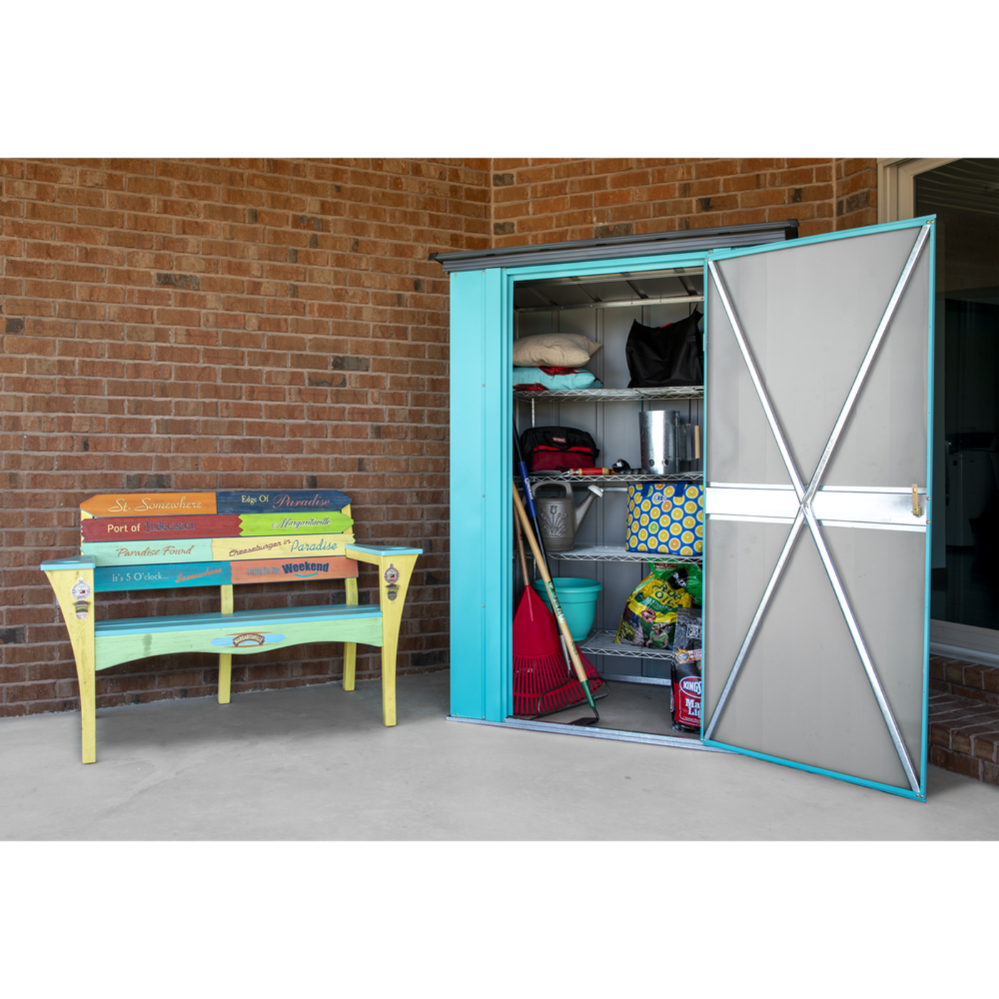 The Spacemaker Patio Shed 4 x 3 Ft. in Teal and Anthracite - CY43T21 is a stylish and compact storage solution designed for small outdoor spaces.