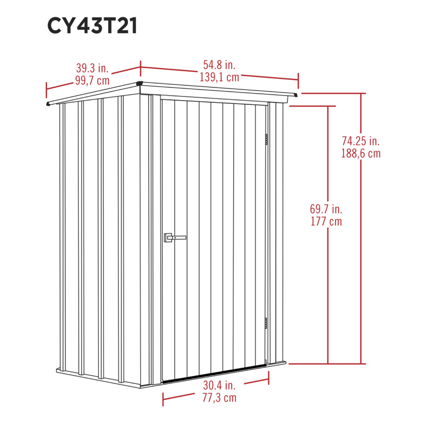 A: The CY43T21 is a compact, weather-resistant outdoor storage shed designed for patios, balconies, and small yards, offering a stylish teal and anthracite finish.