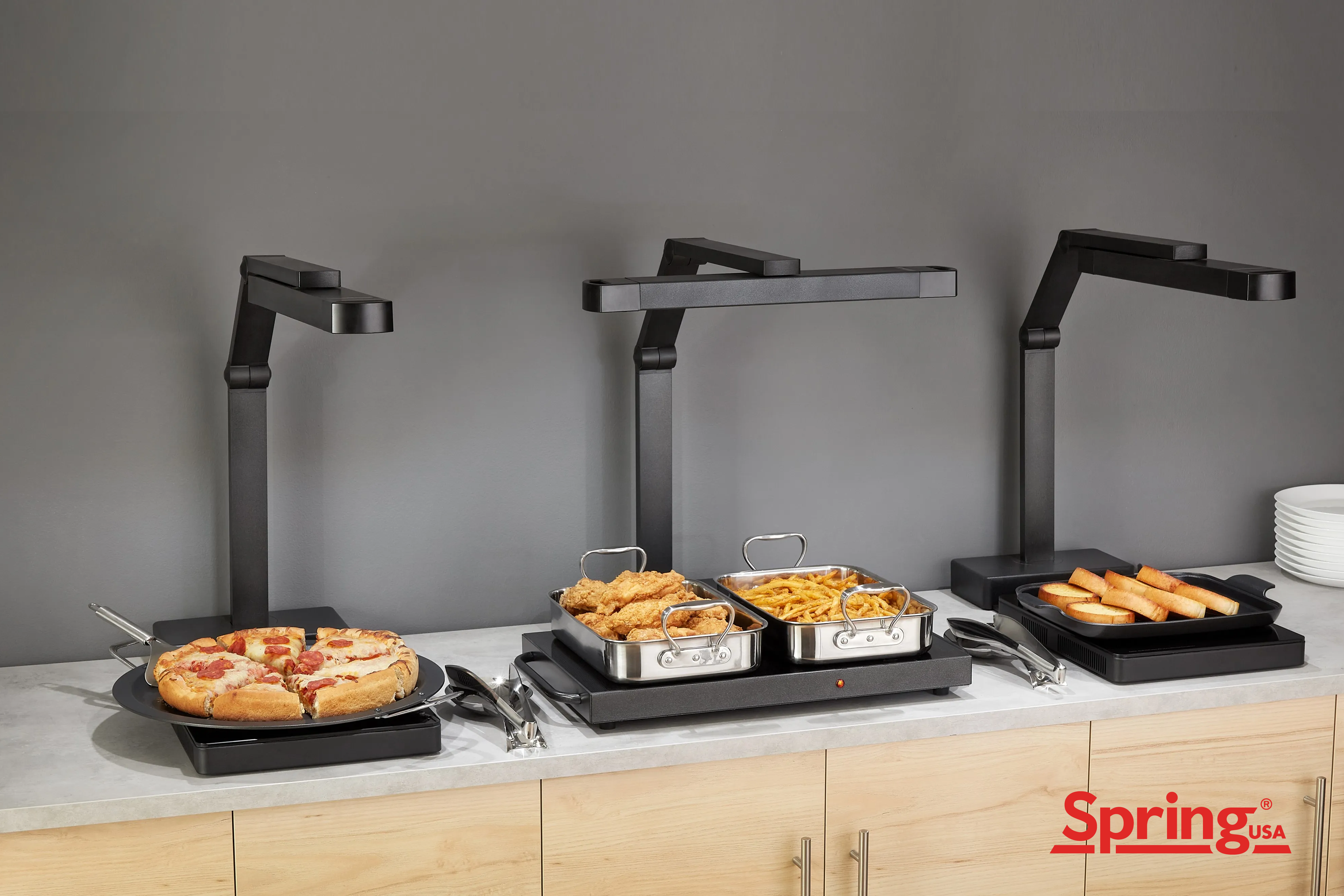 Flexible Positioning: Features dual articulating joints and a 170-degree swivel base, allowing precise adjustment of the lamp's position to accommodate various food setups and serving areas.