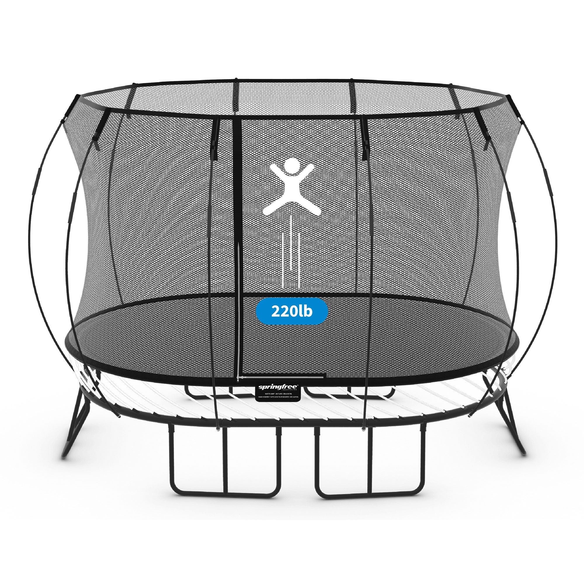 The oval trampoline is excellent for families and kids of all ages who love being active. This bouncy trampoline provides 92 square feet of jumping freedom for toddlers, kids, and adults weighing less than 220 pounds. The innovative design ensures safety with flexible composite rods that eliminate the need for metal springs, keeping little feet and toes safe. Experience how the soft edges gently absorb shock for high bounces that are extra forgiving on knees and joints. Surrounded by an enclosure net, your ambitious jumpers will be safe from falls.