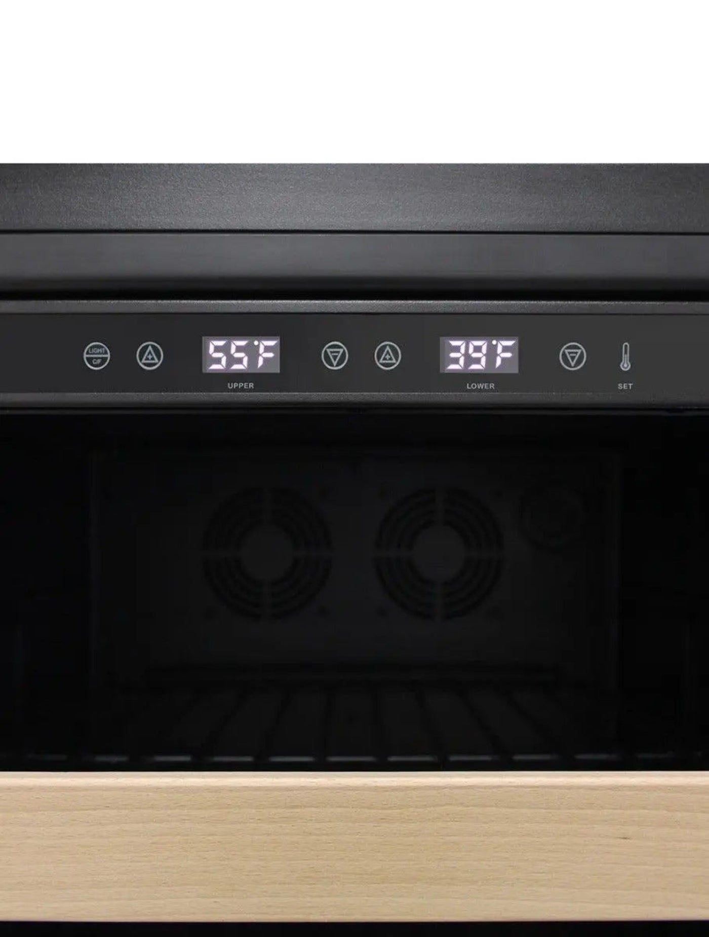 Set the right temperatures for your wine bottles and beverages with simple digital buttons. On the top zone, there are side LED lights in BioBlue that line up both sides of the compartment.