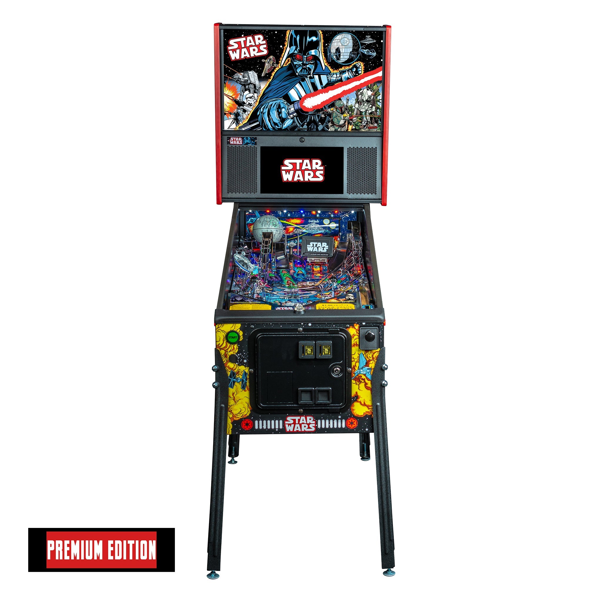 The Star Wars themed Comic Art Pro and Star Wars Comic Art Premium machines made by Stern are packed with features that provide an irresistible game experience. The game includes select dialogue and footage from the original Star Wars trilogy, color-changing LED-lighted inserts, and a sculpted TIE fighter. All models feature two LCD screens. The Premium model also features art representing an exploding Death Star, a sculpted LED-lit Millennium Falcon and an interactive hyperspace loop that encircles the playfield and can accommodate up to 5 pinballs at once.