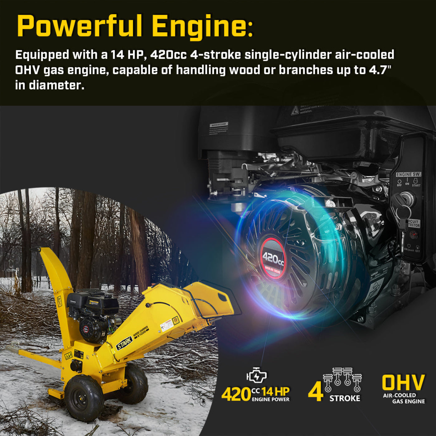- Our wood chipper adopts electric starting 420cc 14HP 4-stroke single cylinder air-cooled OHV gas-powered engine. Easily handles up to 4.7" diameter wood or branch