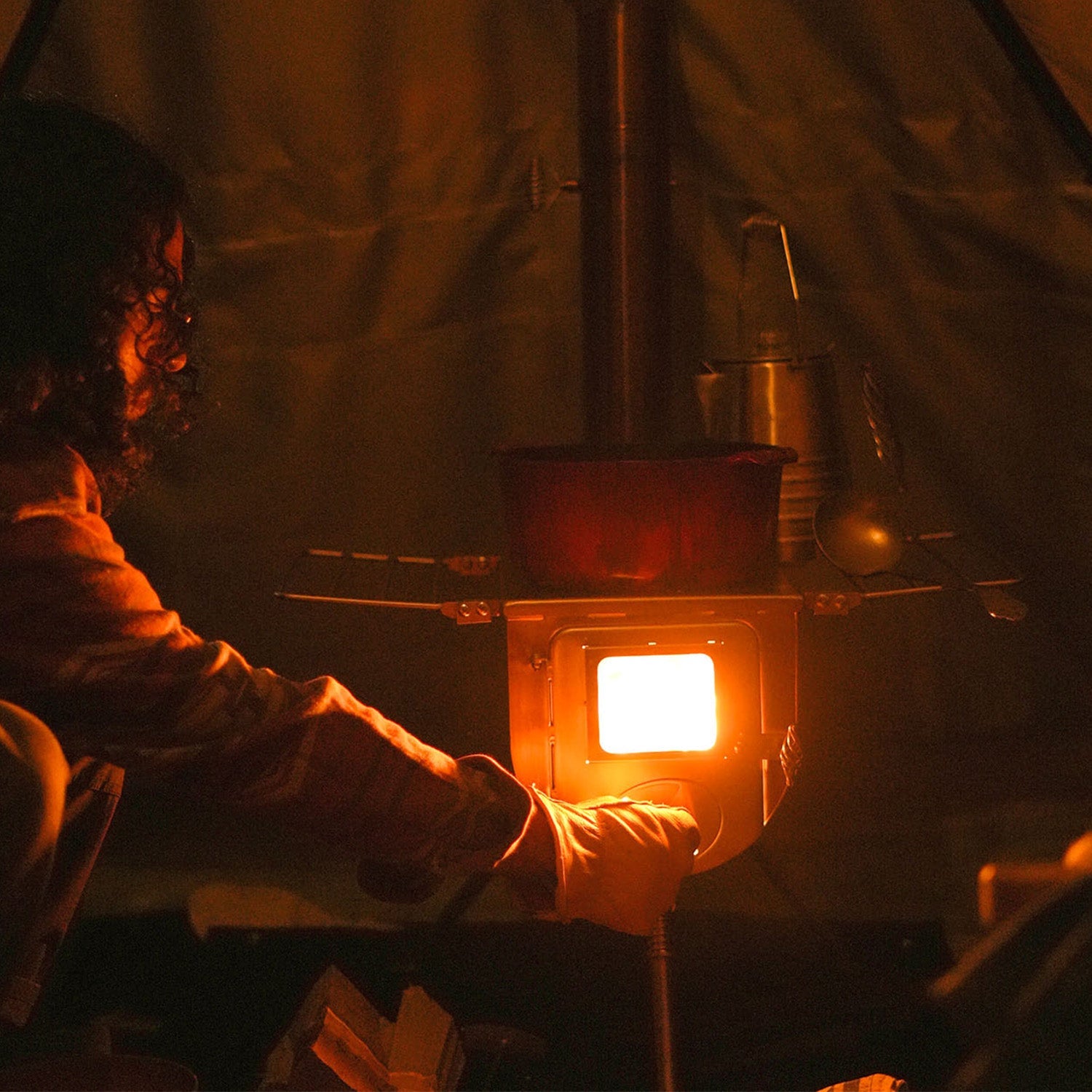 A: The stove features a large glass window for a stunning fire view, external air supply for better combustion, and a spacious design for powerful heating in larger tents or shelters.