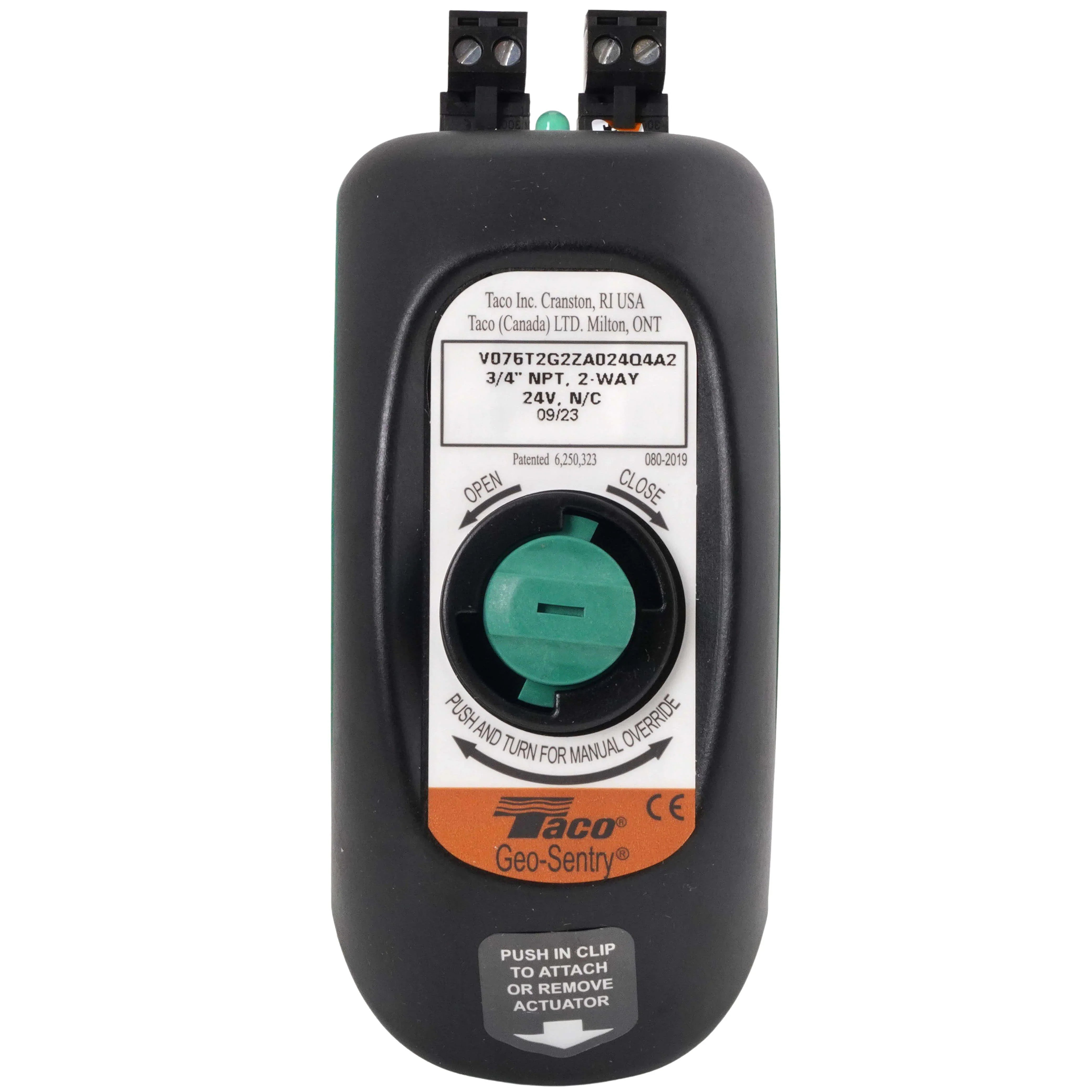 A: The Taco V075T2G2ZA024Q4A2 is a 3/4" NPT 2-way normally closed (N.C.) zone valve actuator designed for use in hydronic heating, cooling systems, and geothermal applications.