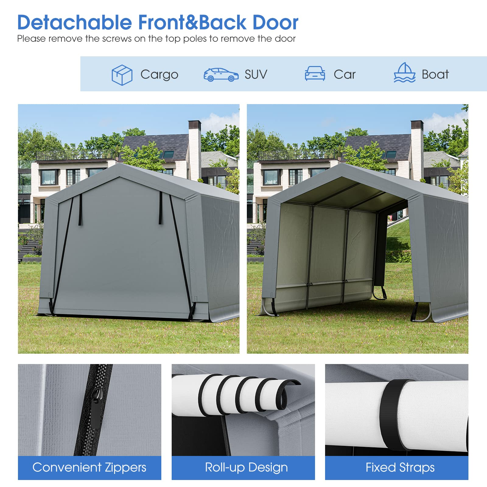 Can be used to store the SUV, boat, cargo, or car, or as a seasonal shade for outdoor
