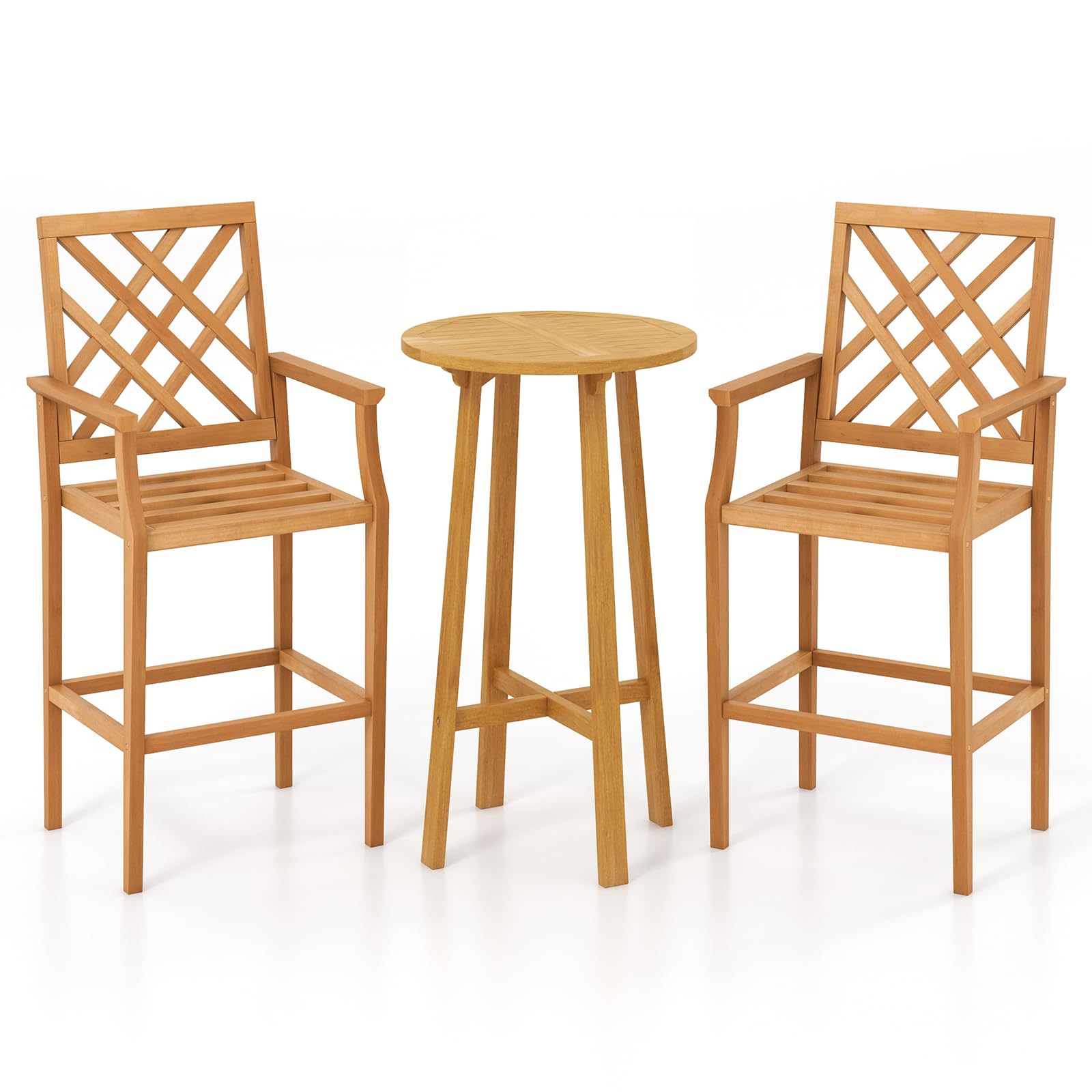 Embrace the allure of nature with this elegant bar table set, seamlessly blending into any indoor or outdoor decoration. Made of solid teak wood, it promises steadfast support for up to 330 lbs on the chairs and 110 lbs on the table. Revel in the comfort of an inclined backrest, armrests, and a 10.5” footrest on each chair, enhanced by slats that invite good air circulation. The bistro table’s X-base ensures a reliable foundation while the bar table offers a roomy platform for your snacks. This patio furniture set’s low maintenance and splinter-free finish ensure more convenience.