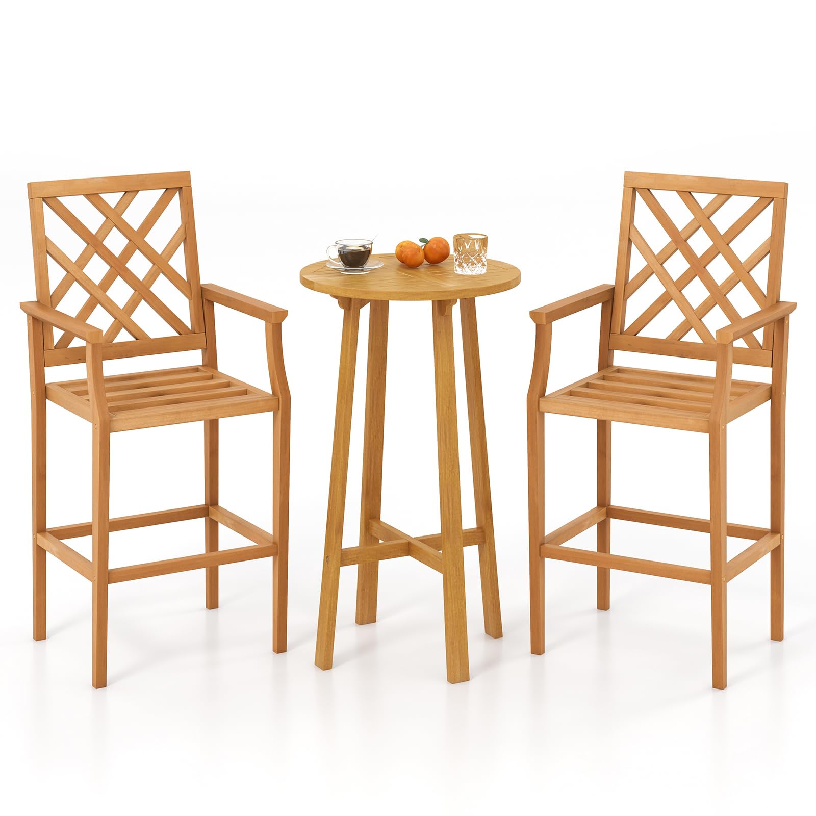 A: The set includes two teak wood bar chairs with backrests, armrests, and footrests, along with a matching teak wood bistro table, perfect for outdoor dining and lounging.