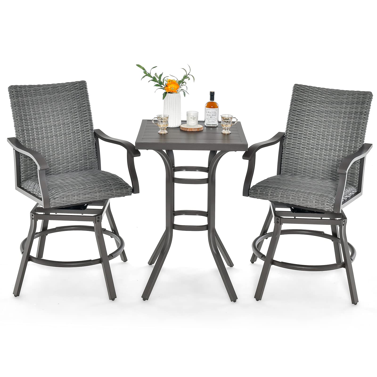 Premium Aluminum Frame: The Tangkula 3-Piece Swivel Bar Set features a sturdy, rust-resistant aluminum frame, ensuring durability and long-lasting outdoor use.