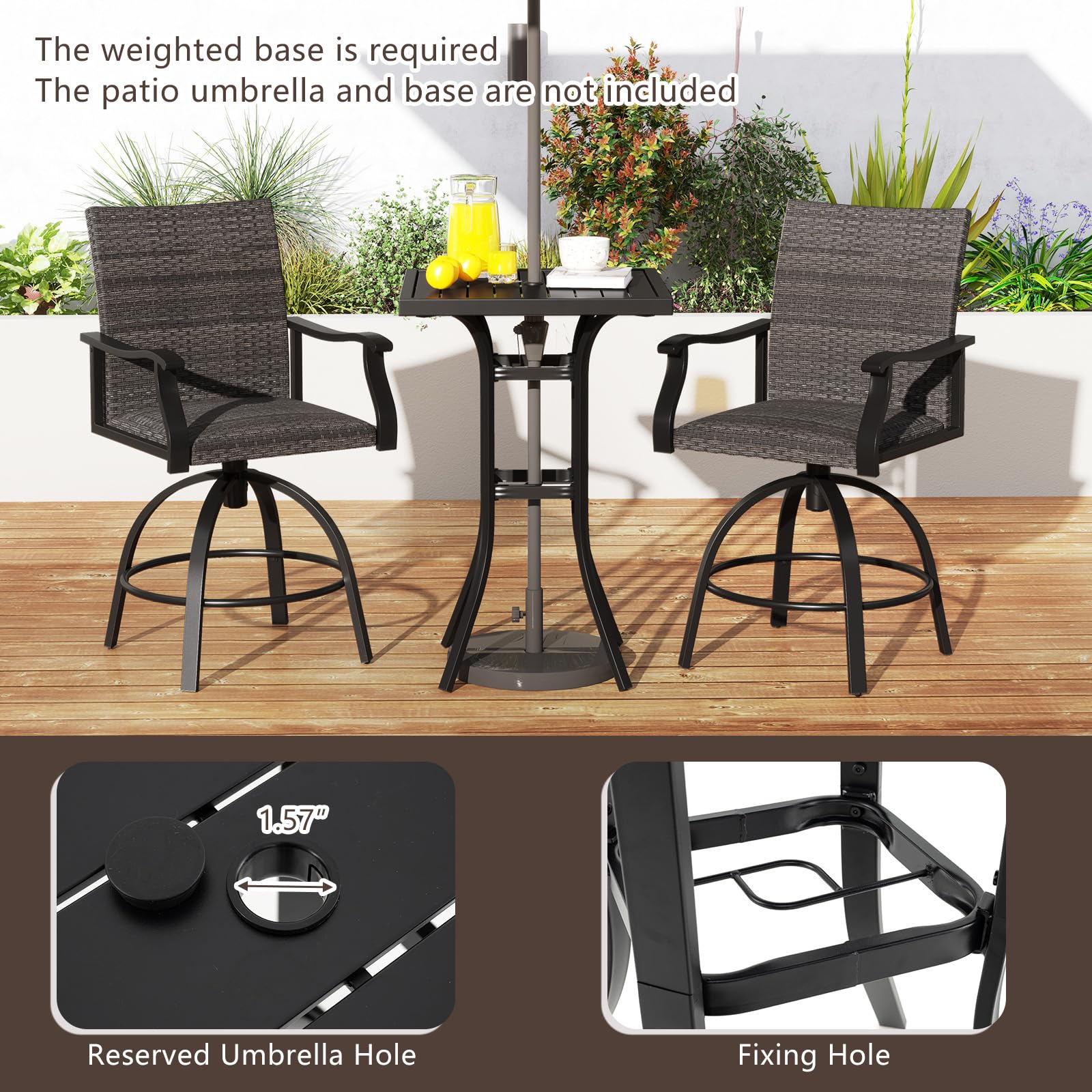 Made from fade-resistant and sun-protective PE wicker and supported by the rustproof aluminum frame, this outdoor bar set is not only long-lasting for the outdoor environment but also stable enough to hold up to 400 lbs per stool and 180 lbs for the table. Additionally, the quick-drying foam provides a comfortable seating experience while making maintenance a breeze. This patio bar set features 2 swivel counter height bar stools with curved armrests and cozy footrests to make you feel convenient and comfortable. The table's smart design includes a 1.57" umbrella hole with a fixing option, ensuring shade and shelter for sunny outdoor moments.