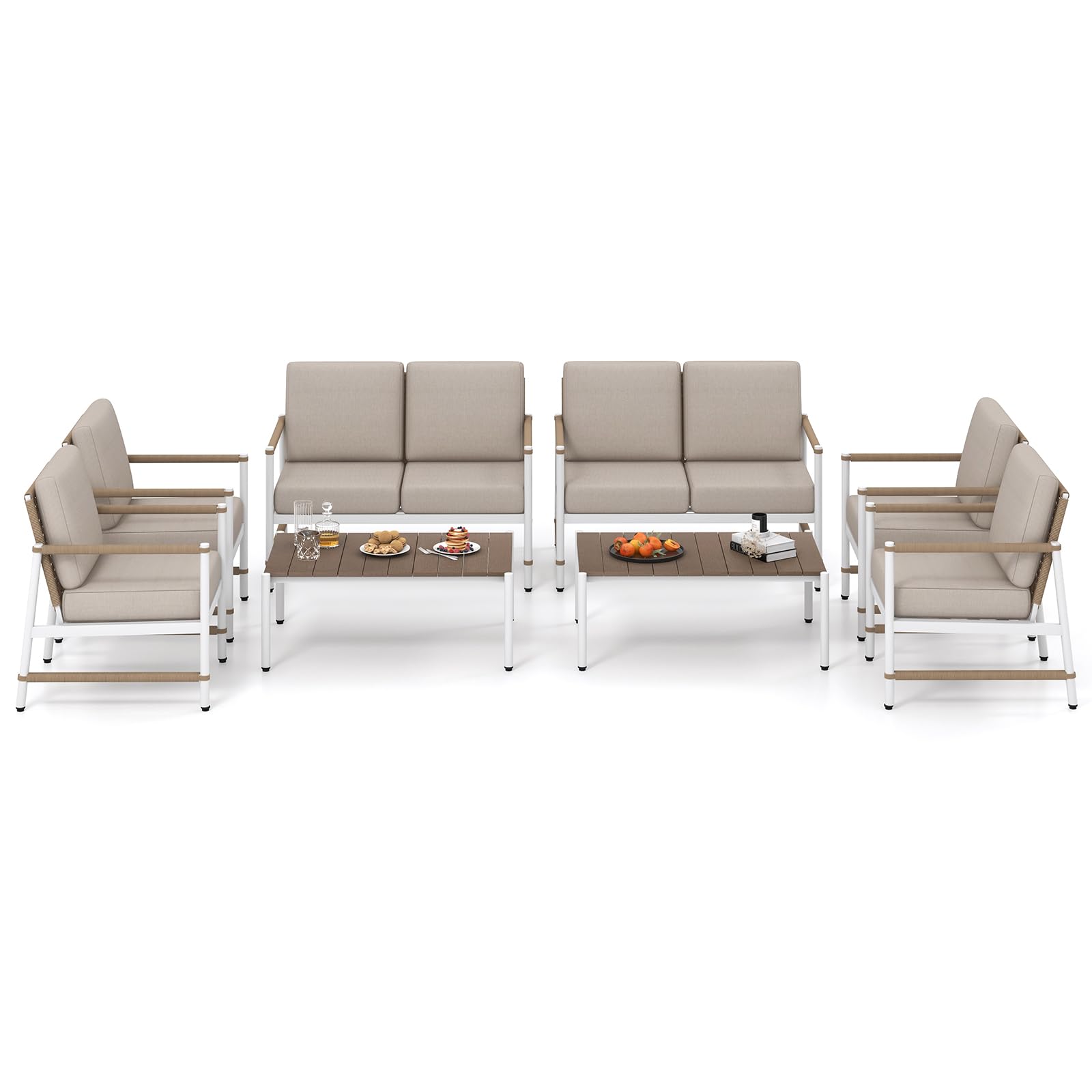 A: The set includes a combination of sofas, armchairs, and a coffee table, available in either a 4-piece or 8-piece configuration, perfect for creating a comfortable outdoor living space.