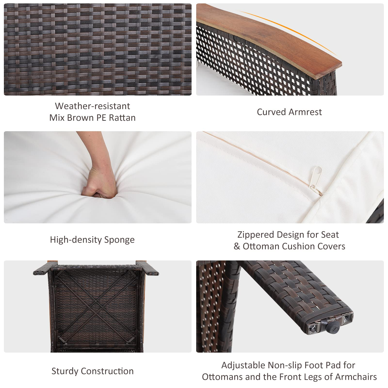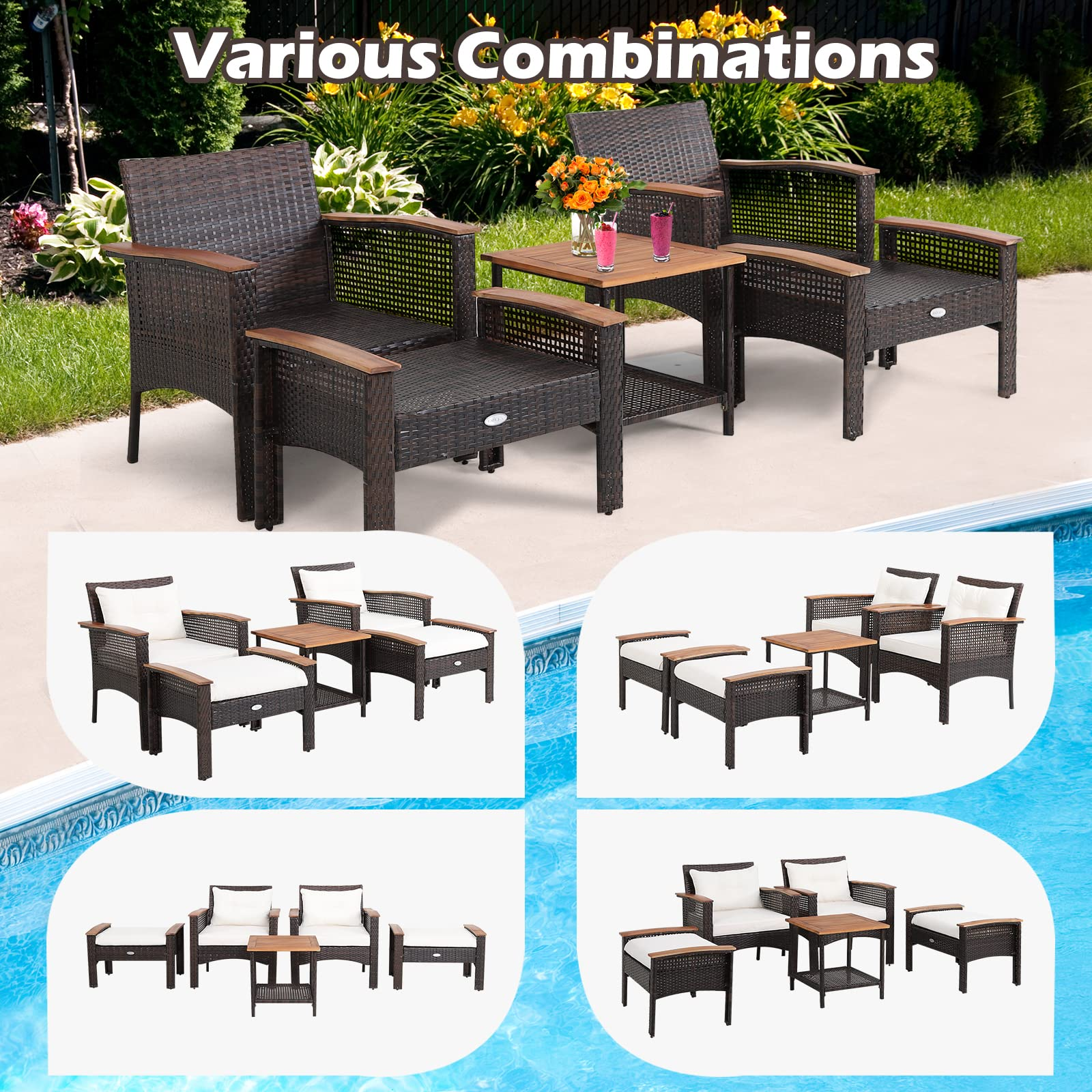 Including 1 coffee table with an extra storage shelf, 2 singles chairs with ergonomic design, and 2 ottomans with removable cushions, this 5-piece outdoor conversation set is comfortable for you and your friend or family to sit on and make different items within reach while bringing various combinations for you to select to fit your different outdoor places. What's more, by combing the all-weather PE wicker with a sturdy steel frame and solid acacia wood, this outdoor furniture set is sturdy and durable enough for long-lasting outdoor service time.
