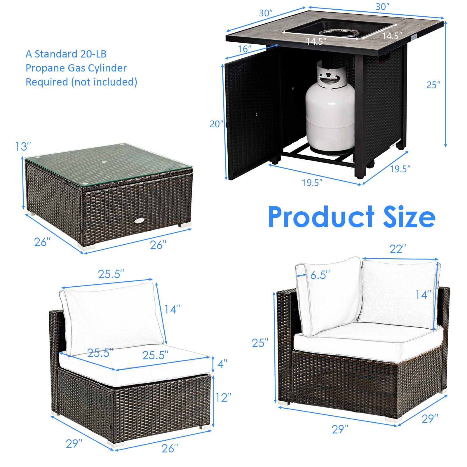 With wide seats and soft cushions, both the corner sofas and armless sofas are ultra-comfortable to sit on. Each cushion is equipped with a smooth zipper, so the maintenance is quite effortless. The coffee table is compact but useful, and its tempered glass tabletop is durable to use. The L-shaped aluminum feet with adjustable footpads highly increase the stability of the sofa set. And the rattan surface is designed for long-time outdoor use. Furthermore, the fire pit table will drive your coldness away and provide additional storage space. Its ceramic tabletop resists well to high temperatures and won't easily fade. Plus, the ignition system is safe and easy to operate. If you are looking for a useful and elegant patio set, this rattan set with a fire table will be a perfect choice.