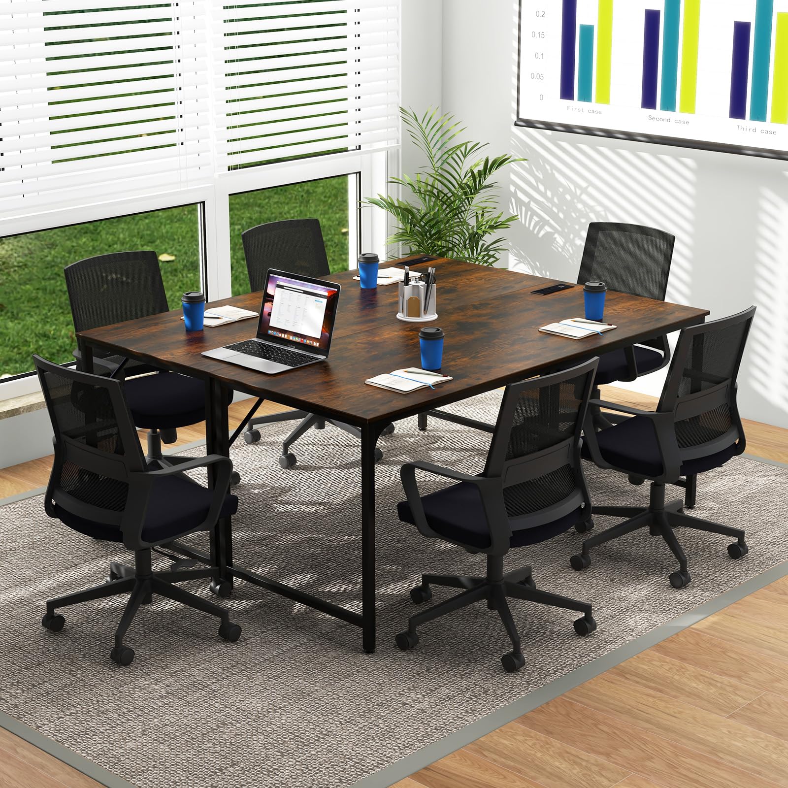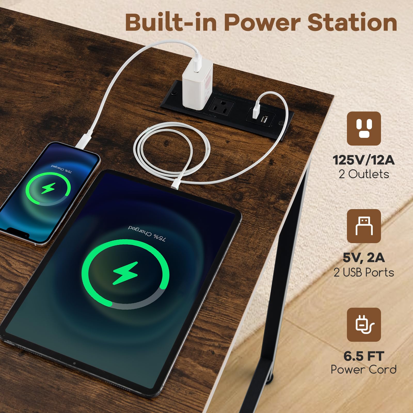 A: This desk features a 60-inch spacious tabletop, a built-in charging station with power outlets & USB ports, a storage bag, and a sturdy metal frame for stability.