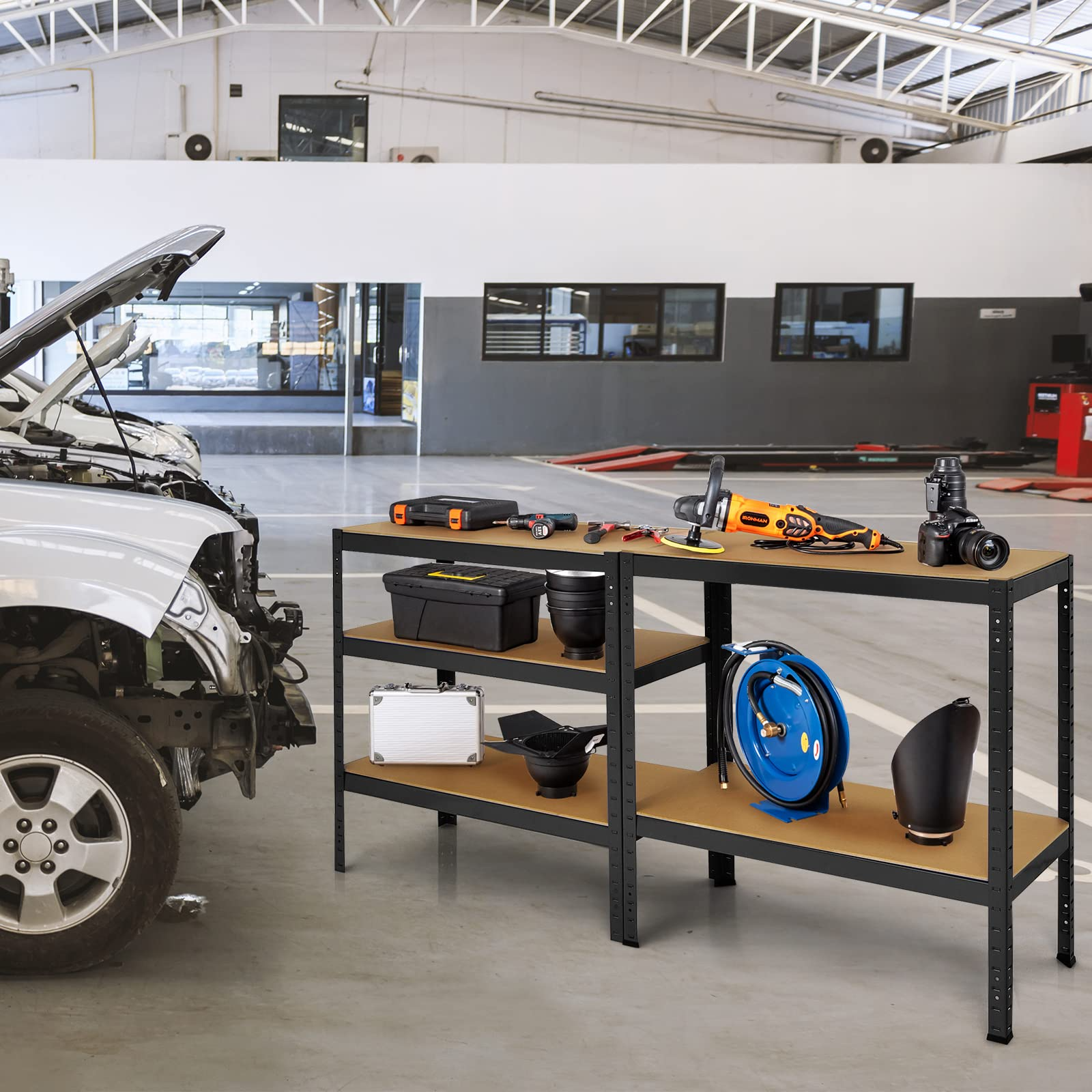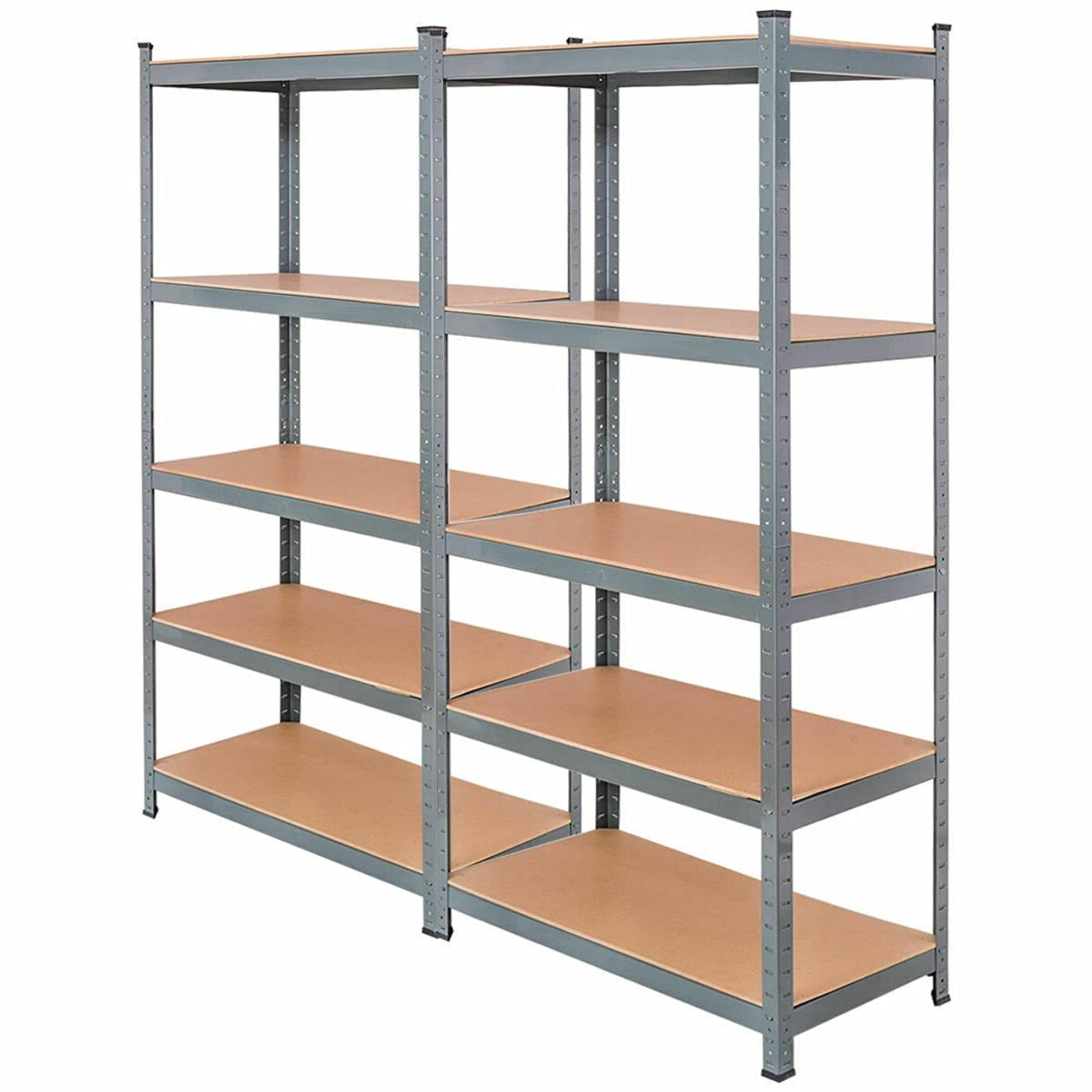 A: The unit includes a heavy-duty steel frame and five adjustable MDF board shelves, offering ample storage space for garages, workshops, warehouses, or utility rooms.