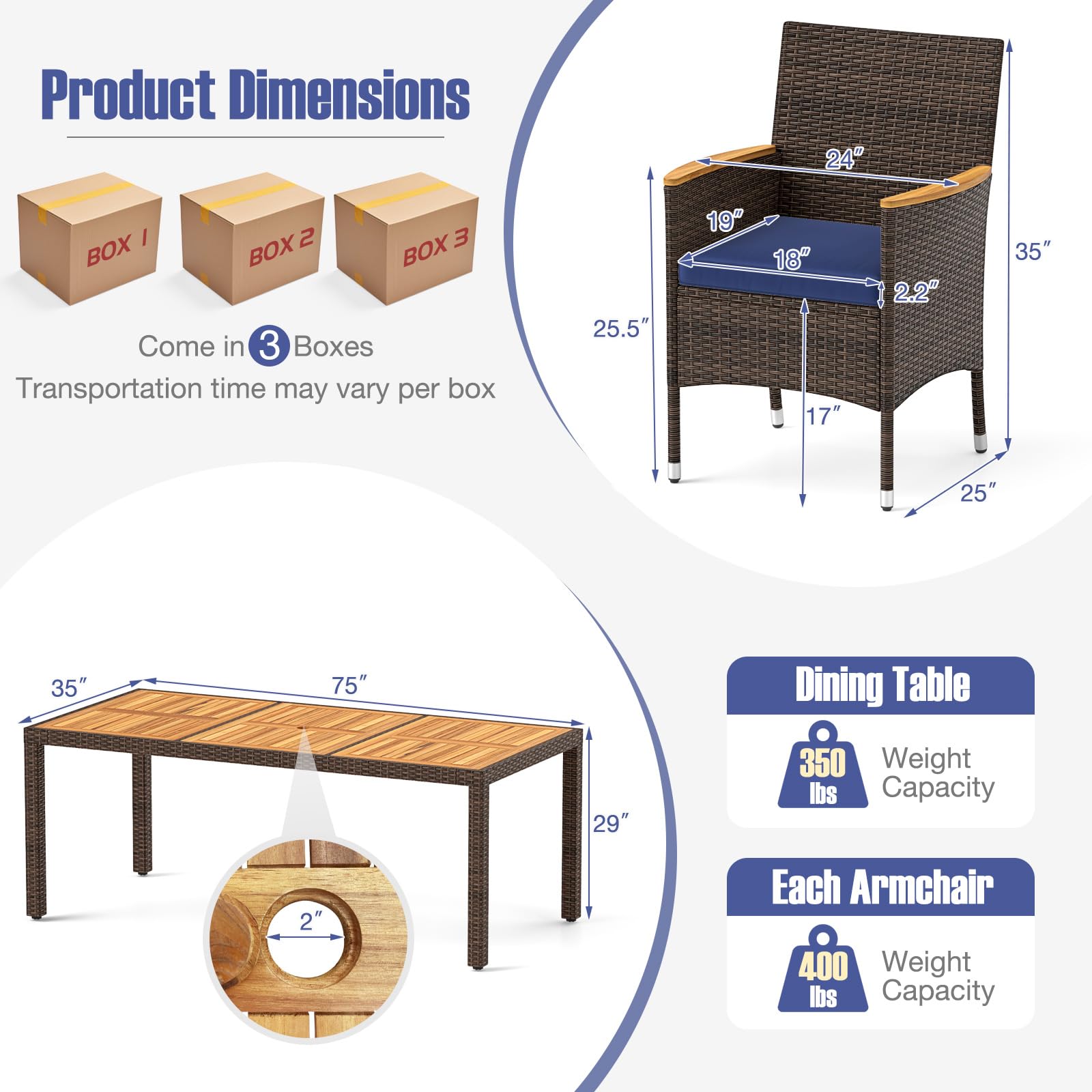 Each patio chair can hold up to 400 lbs for robust and sturdy support. Moreover, these armchairs are ergonomically designed with inclined backrests and curved armrests for optimal comfort. The soft cushions are included for additional coziness. This outdoor table and chairs set features an acacia wood tabletop that is equipped with a 2" umbrella hole for natural beauty and great convenience. Plus, the intelligent space-saving design allows you to tuck 6 chairs under the table, effortlessly maintaining a tidy and spacious outdoor environment.