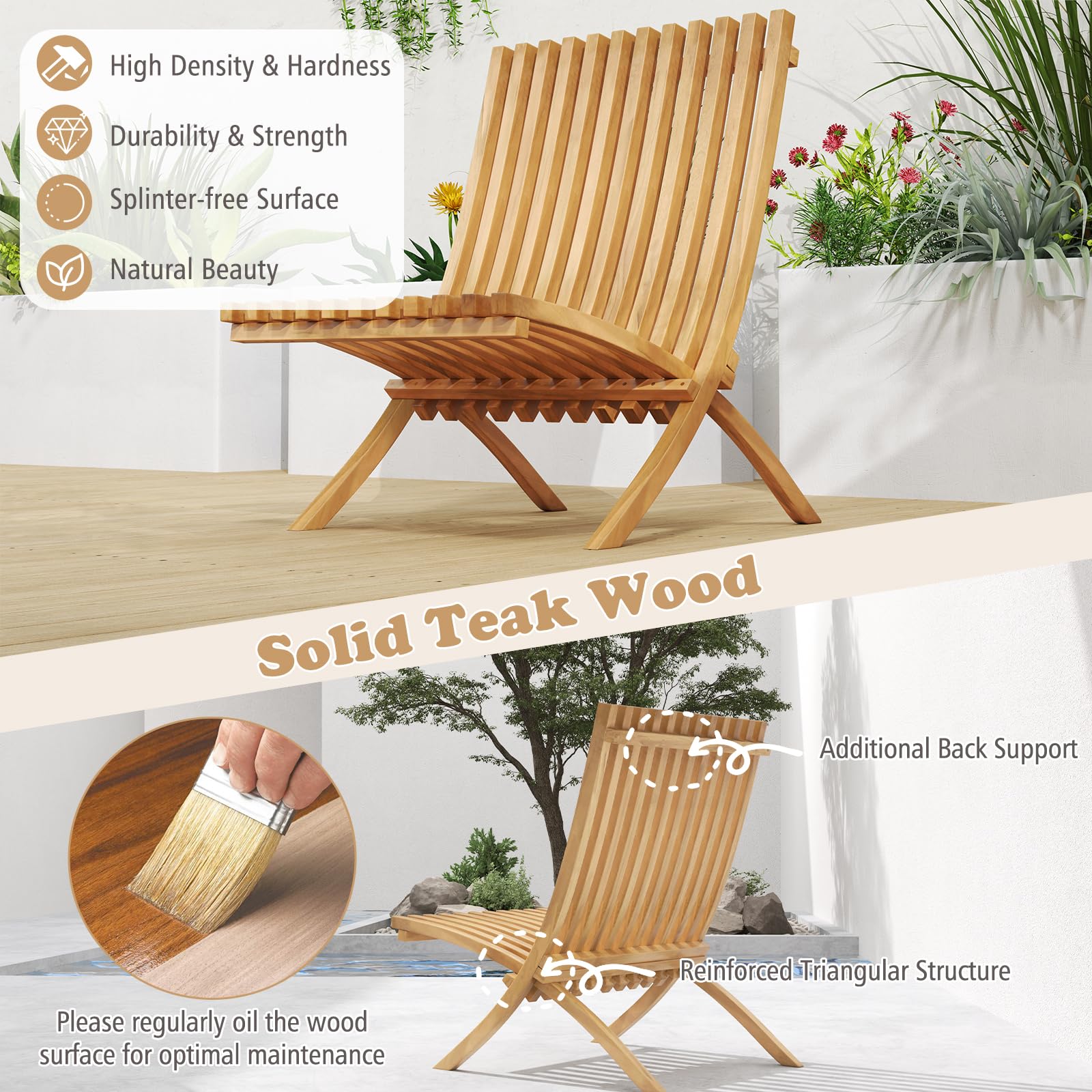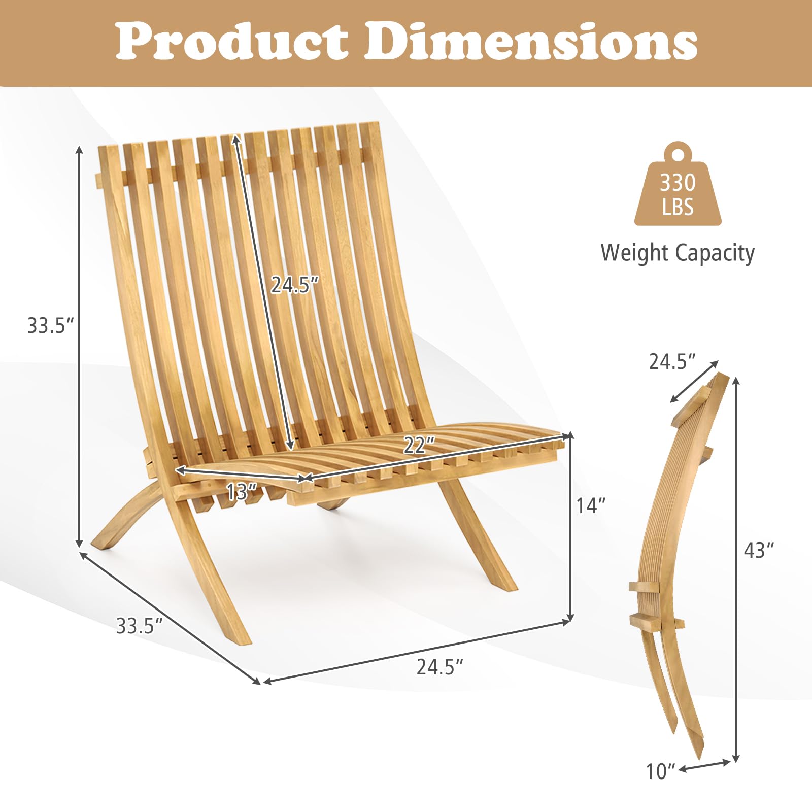 This balcony chair is ready for immediate use as it comes fully assembled, allowing you to forgo complicated setups. Crafted from long-lasting and naturally beautiful teak wood known for its strength and durability, this porch chair accompanies you for years to come. Moreover, this garden chair folds conveniently with its easy-to-fold design for quick storage. The patio lounge chair's low-profile seating, 14 inches from the ground, is ideal for cozy evenings near a fire pit or serene fishing sessions. Featuring a 22-inch wide seat and a breathable, slatted design at a 105° ergonomic angle, this patio bistro chair offers unparalleled comfort and supports optimal relaxation in your garden, porch or yard.
