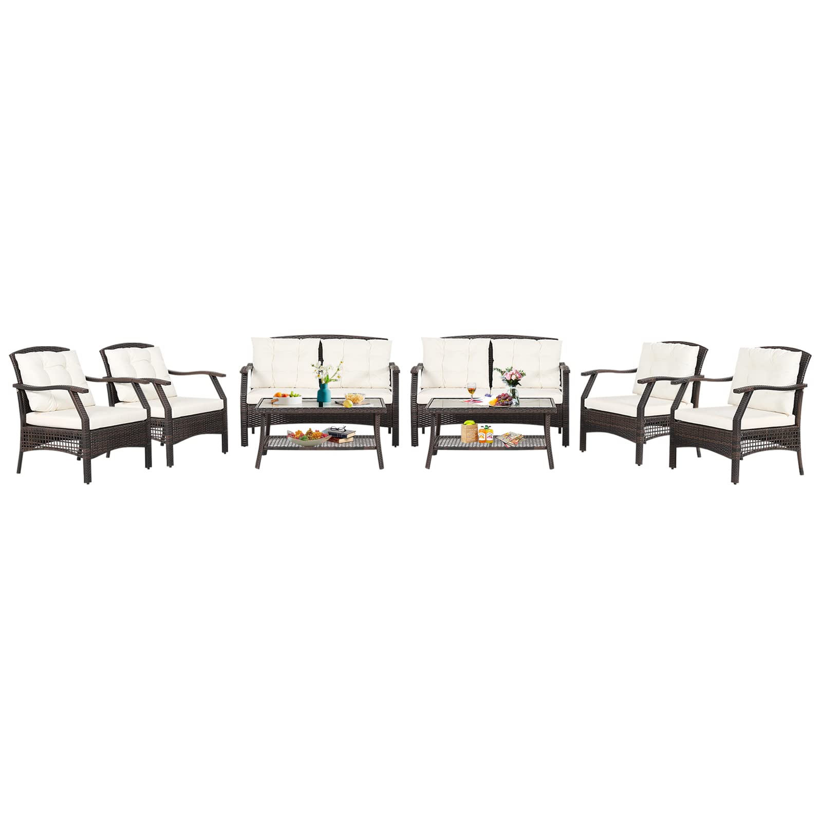 This 8 pieces patio furniture set will be a perfect choice for you. High-quality PE rattan and sturdy steel frame feature outstanding sturdiness and durability. Soft cushions also ensure a comfortable seating experience. The durable Oxford fabric cover with waterproof PU coating can extend the service lifespan. Designed with ergonomic backrests and armrests, it can relieve your fatigue instantly. Please refer to the size description before purchase(there may be small dimensional discrepancies because of the manual measurement). Please do not tighten all the screws until all the holes are aligned.