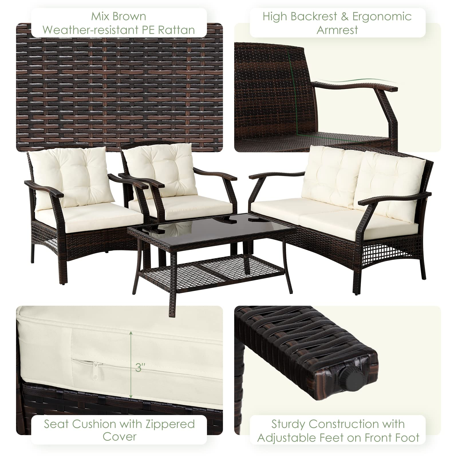 Low Maintenance: The weather-resistant wicker and removable cushion covers make the furniture easy to maintain, ensuring hassle-free cleaning and upkeep.