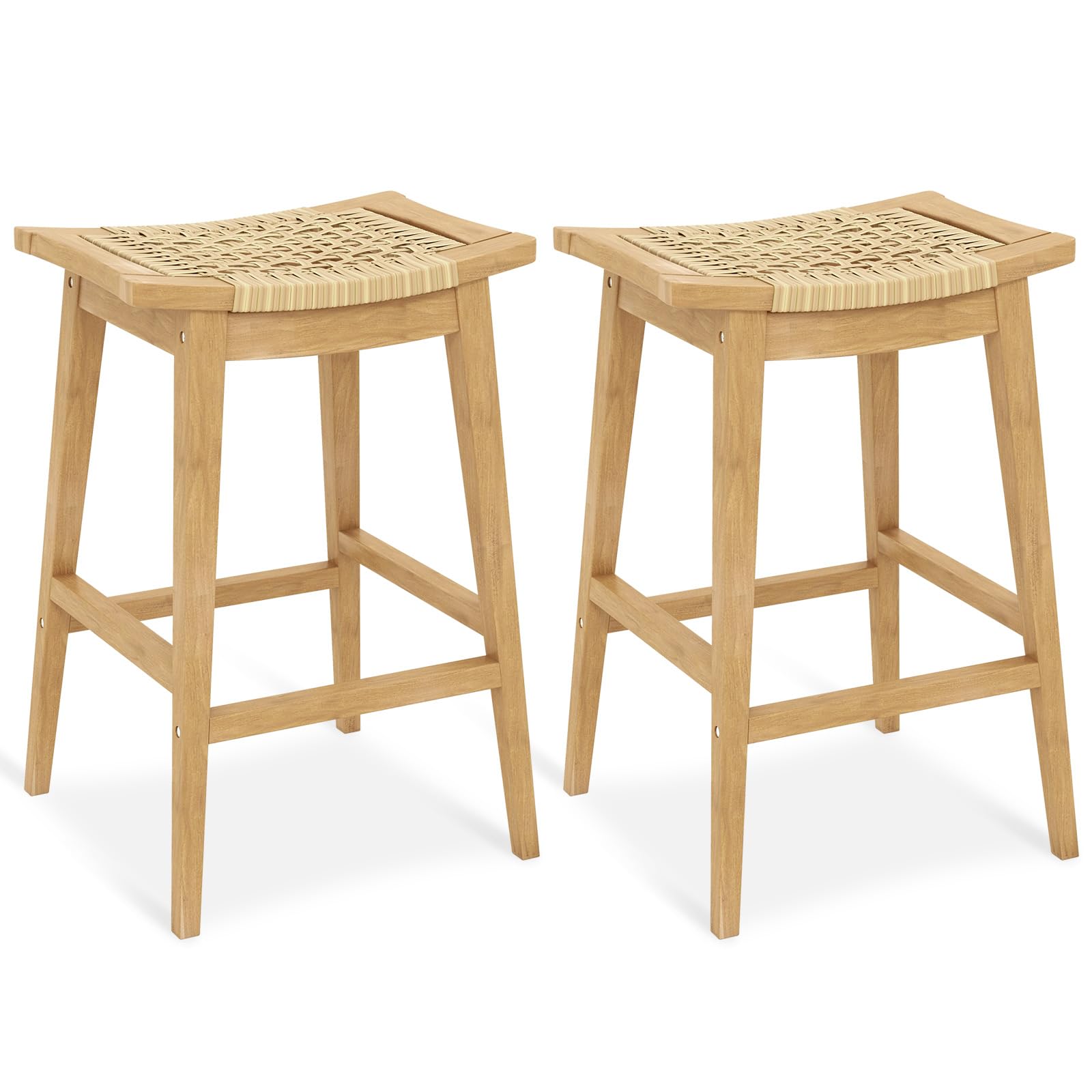 Crafted with a natural teak wood structure, the patio bar stool is stable and enduring , supporting up to 330 lbs. Its ergonomic design includes a saddle seat that conforms to your hip and 9” high footrests for leg relaxation. Adorned with premium PE rattan, the barstool exudes durability and bohemian charm. Suitable for indoor and outdoor use, it can be easily moved with dual handles. With dimensions of 19.5” L x 16.5 ”W x 29”H, the bar height stool boasts a smoothly painted surface for easy maintenance. To preserve its longevity, it is recommended to avoid leaving the bar chair outdoors in the rain.