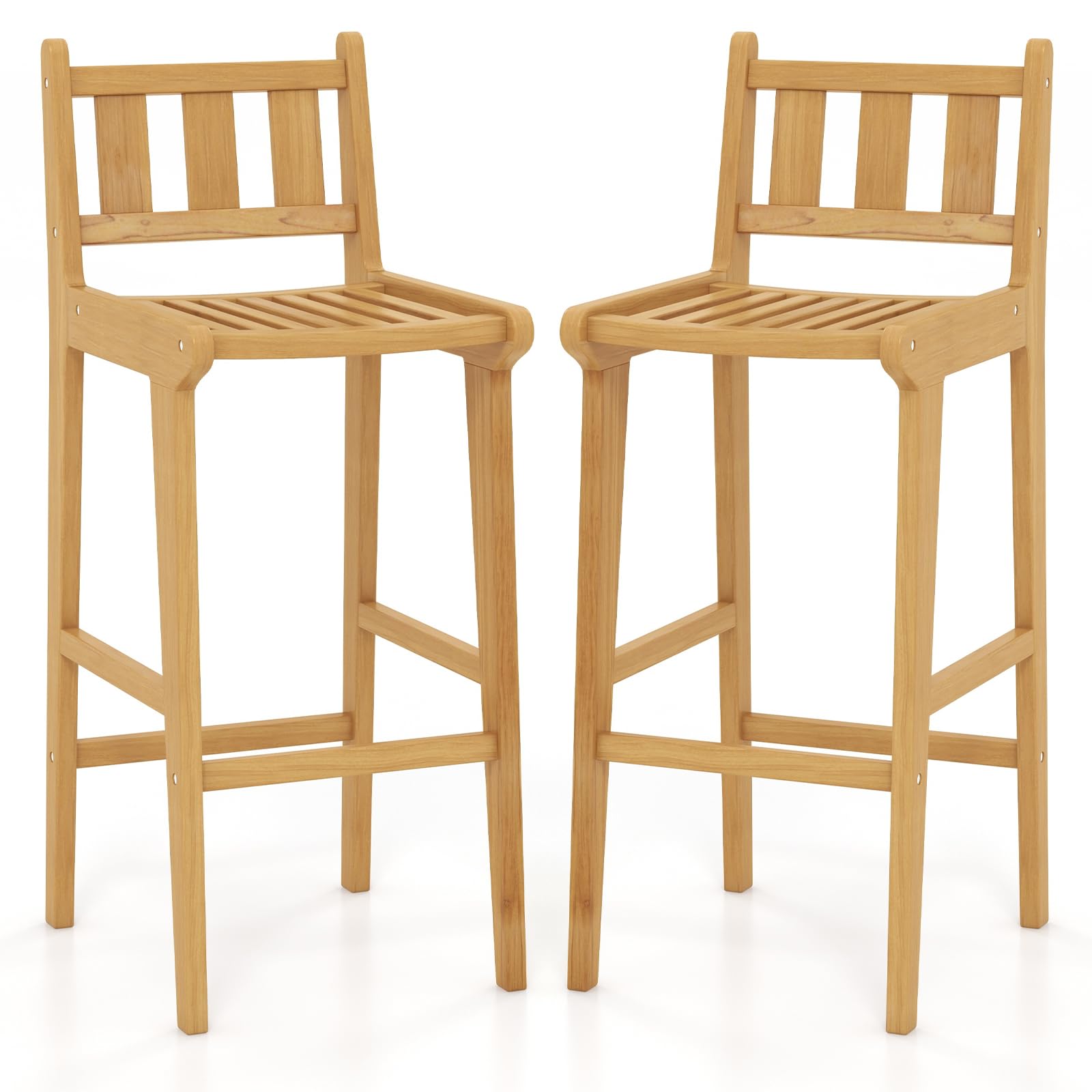 Crafted from sturdy, enduring teak wood, the bar chair is perfect for a long-term use. All for optimal sitting comfort, the bar stool features an ergonomic backrest and a footrest for added comfort and support. With a weight capacity of up to 330lbs, it promises stability. The slatted surface design enhances the patio chair’s aesthetic appeal and promotes airflow. Its versatility allows for use indoors and outdoors, complementing any space with a touch of rustic charm. Ideal for bar tables ranging from 40” to 43”in height, this low-maintenance barstool features a painted surface for easy up keep. To extend the product’s lifespan, please avoid leaving it outdoors in the rain.