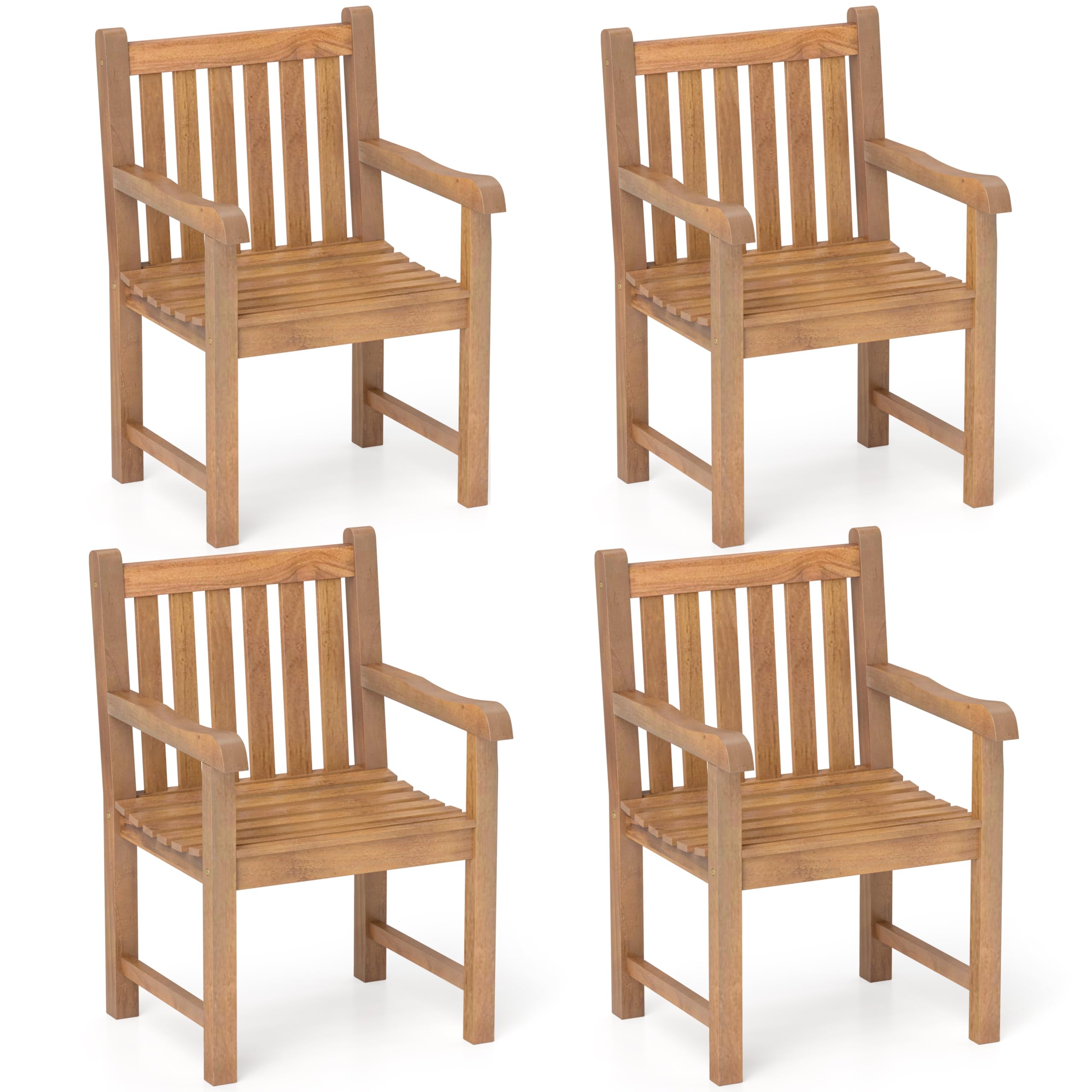 Made with high-quality teak wood frame, the chair ensures crack-resistance and excellent stability, enabling you to sit for years to come. Moreover, the patio chair also features an ergonomic backrest, slatted seat, and extra armrests for added comfort and relaxation. It supports up to 330 lbs. The rounded corners and splinter-free surface ensure safe touch. This solid wood armchair adds a touch of natural texture to any outdoor space, including yards, patios, porches, poolsides, etc.