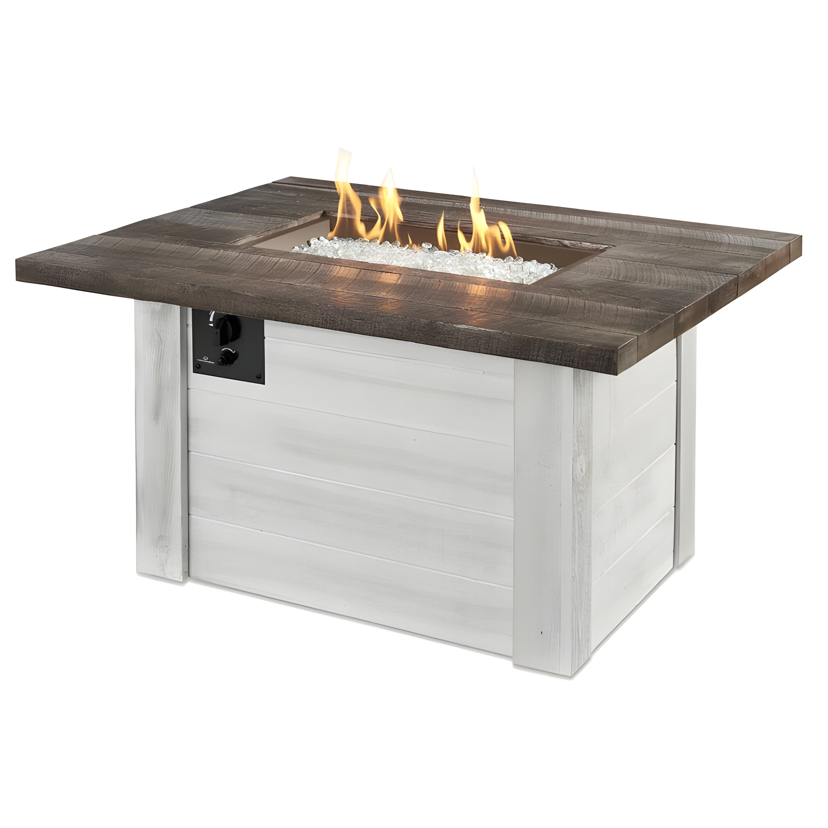 Create a warm and inviting outdoor space with the Alcott Rectangular Fire Pit Table from The Outdoor GreatRoom Company. This modern farmhouse-inspired fire pit table features an Antique Timber Supercast top with a matching burner cover and a whitewashed shiplap wood base. The 55,000 BTUs rated Crystal Fire stainless steel burner provides a beautiful full flame, complemented by 10 lbs of diamond glass fire gems for a sparkling effect. The battery-powered spark ignition system allows for easy control over the burner, while the slide-out access door discreetly conceals your 20 lb propane tank. Light up the night and enjoy the cozy glow of this stunning fire pit table for many years to come.