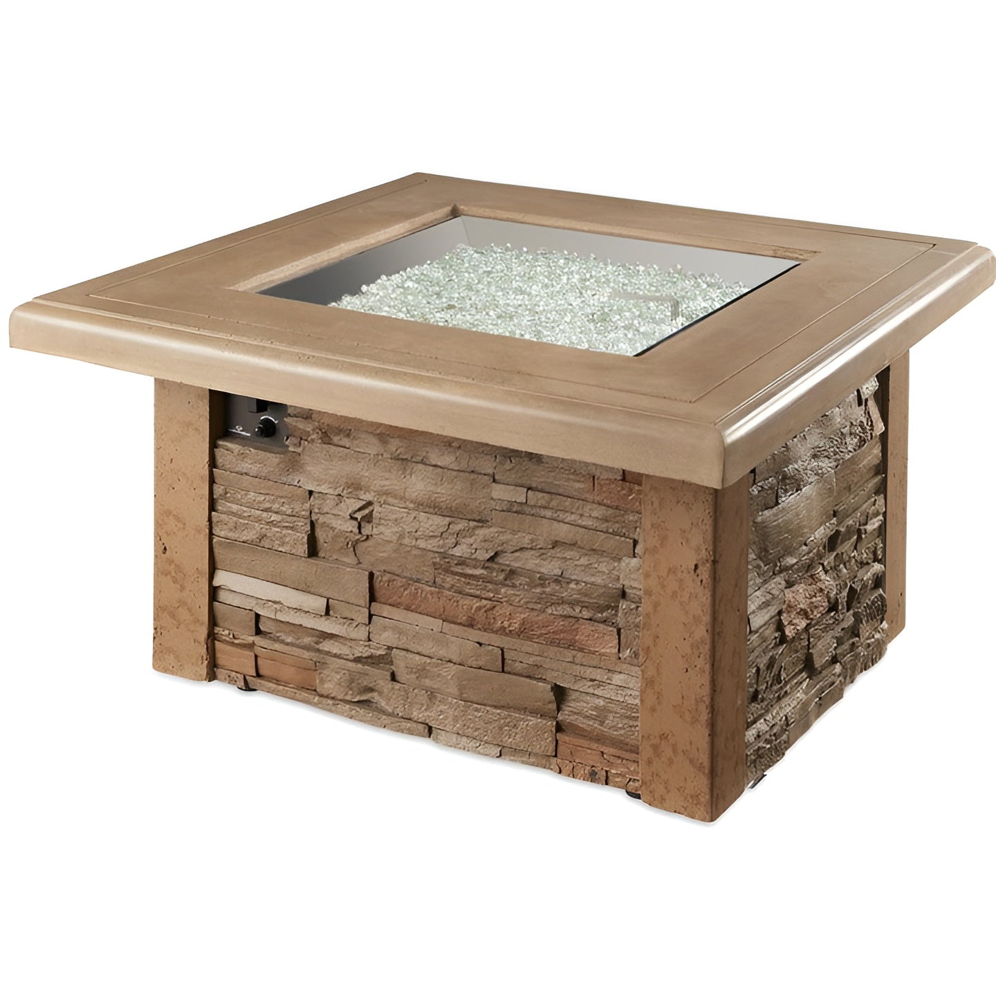 Light up the night and create a warm gathering place with the Sierra Fire Pit Table from The Outdoor GreatRoom Company. Combining the look of stacked stone with a natural-looking supercast top, this fire pit table brings a sophisticated outdoor feel to your backyard. The exterior grade base provides durable support for the heavy-duty supercast table top. The 24-inch square stainless steel CF-2424 Crystal Fire burner is rated for up to 105,000 BTUs, providing a beautiful full flame that will add warmth and ambiance to your outdoor space. Included with the table is a matching supercast burner cover and 20 lbs of diamond glass fire gems to create a sparkling flame effect. The battery-powered spark ignition system offers simple control over the burner, and the slide-out access door conceals your 20 lb propane tank. The Sierra Gas Fire Pit Table arrives configured for propane, but it can be converted to natural gas for added convenience.