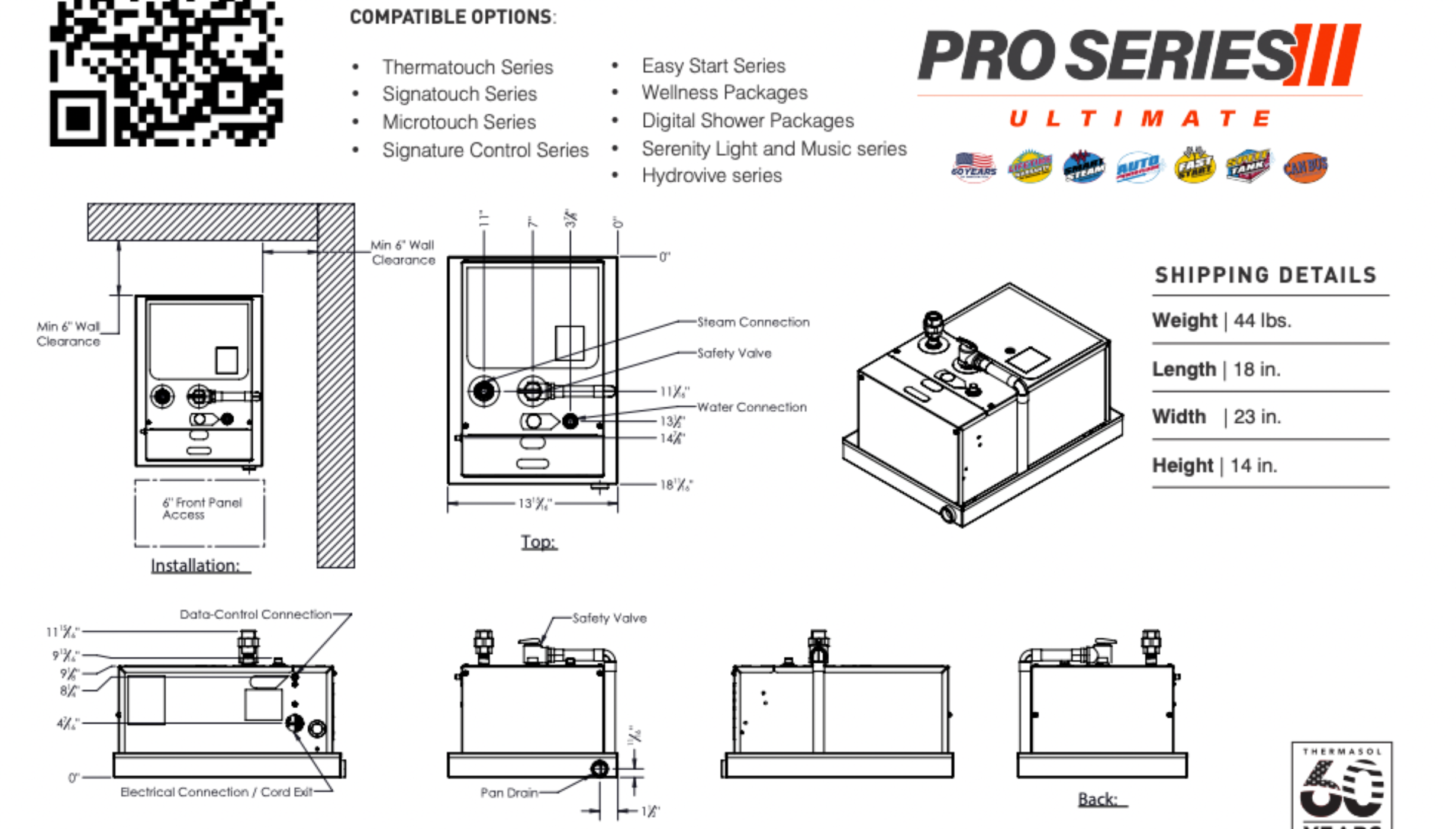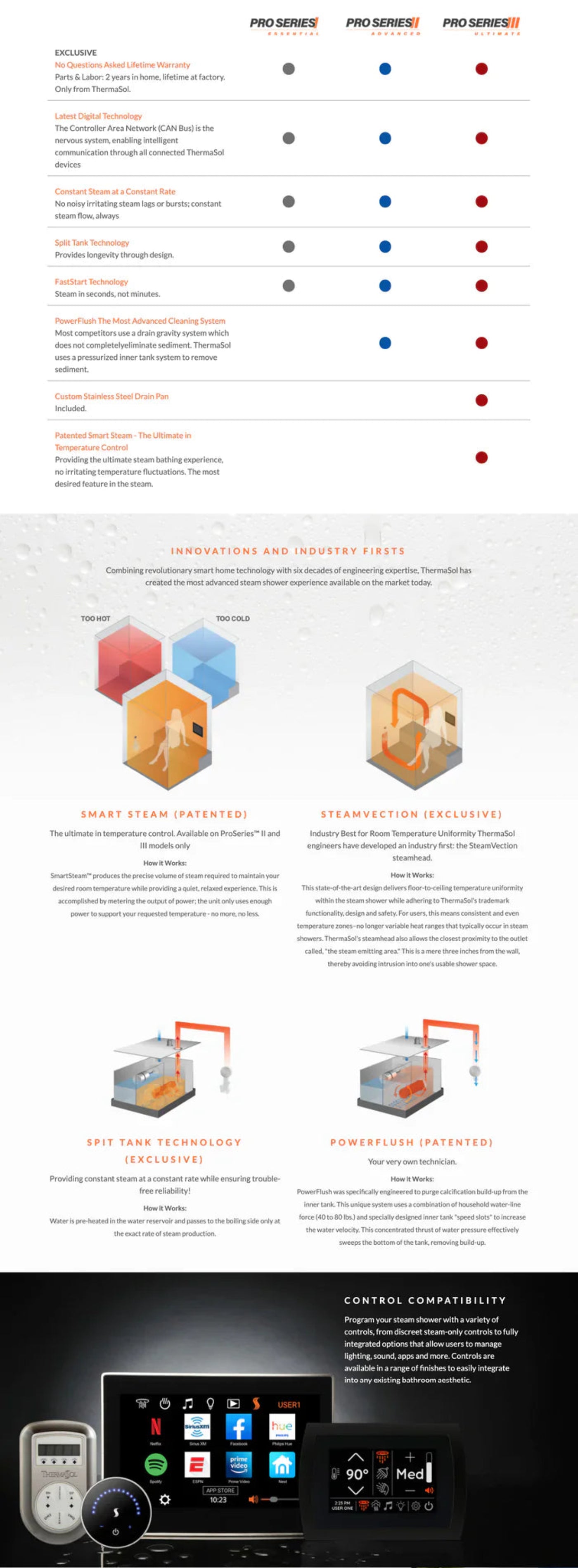 Now offered in the Pro Series combines the latest technology with ThermaSol durability, performance and efficiency to ensure a consistent steam shower experience every time. Each Pro Series model is crafted with the same industrial-grade stainless steel and lifetime warranty, plus performance-engineered to deliver constant steam at a constant rate, split-tank technology and state-of-the-art energy efficiency technology. Pro Series III offers the next level of sophistication with an advanced cleaning system and a stainless steel drain pan. Pro Series III is the only model to feature the ultimate in Smart Steam temperature control.1) a steam shower controller and