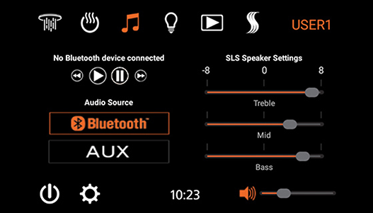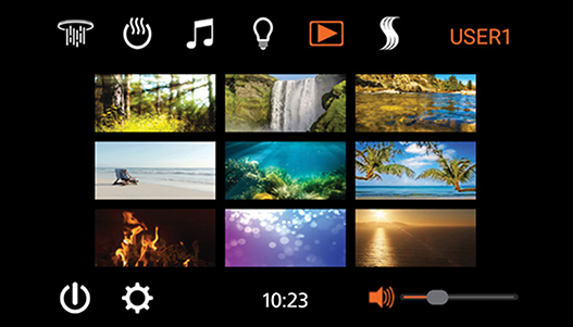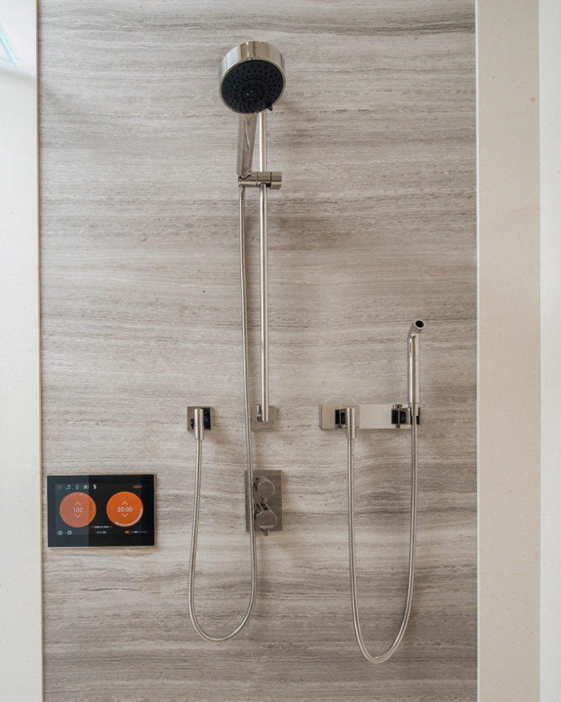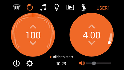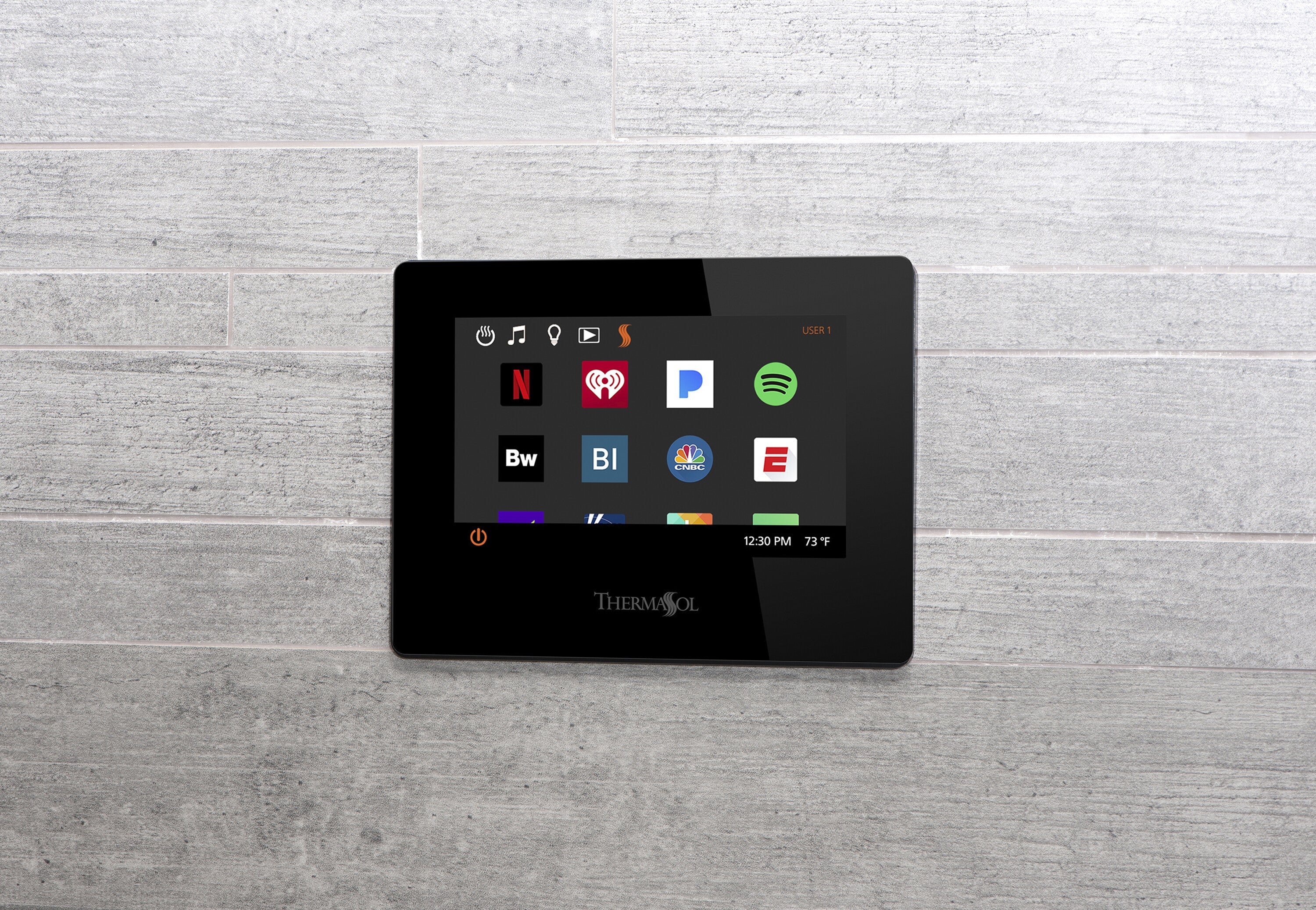 The ThermaTouch LCD in-shower touchscreen controller manages all aspects of the digital shower and steam generation, from steam duration and temperature to operation of audio and lighting modes.